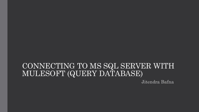 provides wide range of connectors which is very handy while integrating solution. In many scenarios, we required to connect to database for querying, inserting and updating the table. Mulesoft provides a database connector which allows JDBC connectivity with relational database to execute various SQL operations like Select, Insert, Update, Delete and Stored Procedures. Mulesoft provide database connector to connects various JDBC databases like MS SQL, Oracle, Derby, MYSQL etc. Prerequisite To connect MS SQL Server With Mulesoft • Download and Install sqljdbc4.jar file. It will require to connect MS SQL database. • Ensure that TCP/IP port is enabled in SQL configuration (default port is 1433). • Add sqljdbc4.jar into your build path of Mule application. Right click on your application then Build Path < Configure Build Path < Libraries < Add External Jars.