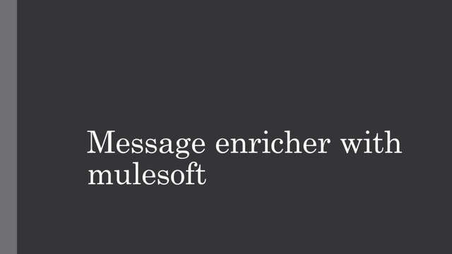 with Mulesoft. There are various scenarios where you can use Message Enricher component. • When synchronizing data between data sources, you often check to see if a record already exists in the target resource • If you simply add an endpoint to query the target resource first before adding it, the response would become the payload – This is not what you want • You want the external call to act as an enrichment of the existing message with the original payload retained.