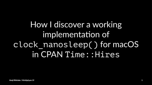Sierra 10.12 SDK • clock_nanosleep(): s6ll undefined • So I need to build my own equivalent func6on to subs6tute clock_nanosleep() • macOS uses mach_absolute_time(), mach_wait_until(), mach_timebase_info(), etc., defined in <mach/mach_time.h> Kenji Rikitake / Kichijoji.pm 19 6