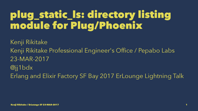 Professional Engineer's Office / Pepabo Labs 23-MAR-2017 @jj1bdx Erlang and Elixir Factory SF Bay 2017 ErLounge Lightning Talk Kenji Rikitake / ErLounge SF 23-MAR-2017 1