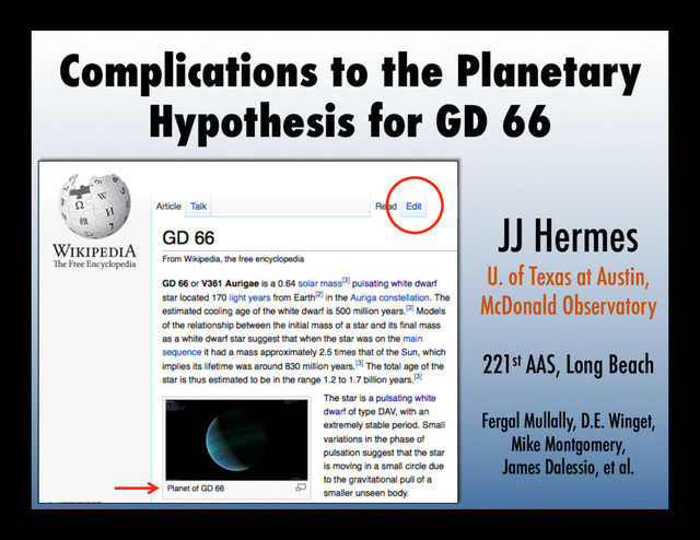 Planet JJ Hermes, UT-Austin, 221st AAS Periodic modulation in the pulse arrival times of GD 66 had been interpreted as evidence of a possible planetary-mass companion." " Continued observations show that two modes in the star are in fact modulated at a 4-year period." " Unfortunately both modes are nearly exactly out of phase with each other. This cannot be space motion caused by a planetary companion." " Pulsating white dwarf stars can still be used to search for planets, but they are not as well behaved as we wanted them to be!"