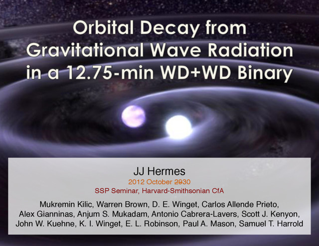 orbital decay in a 12.75-minute WD+WD binary, confirming the system emits gravitation waves! – Observed rate of orbital decay: !(–11.4 ± 1.7) x 10-12 s s-1! – Expected rate from solely GR: !(–8.2 ± 1.7) x 10-12 s s-1! • Follow-up observations have constrained the system parameters:! – M1 = 0.26 ± 0.04 M¤ ! ! !M2 = 0.50 ± 0.04 M¤ ! – R1 = 0.0371 ± 0.0012 R¤ ! !R2 = 0.0142 ± 0.0010 R¤ ! – T1 = 16,530 ± 200 K ! ! !T2 = 8700 ± 500 K! • We will continue monitoring this system: The mid-eclipse time have already shifted by ~15 s as compared to April 2011! – Further observations will explore the difference between pure gravitational wave losses and tides, as the stars are spun-up to remain synchronized! – This tidal efficiency is sensitive to the internal ELM WD composition! • Our newfound pulsating ELM WDs will allow us to explore g-mode pulsations in He-core WDs! – We can perform asteroseismology to explore their interior structure!
