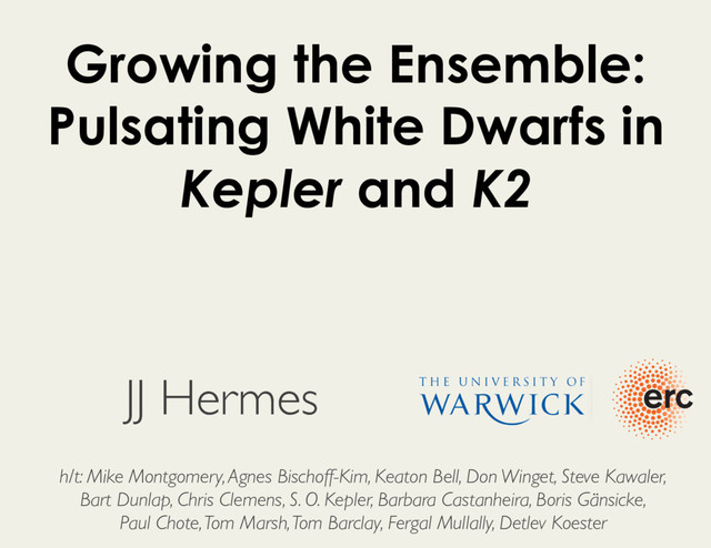not exactly 0.5. If we adopt the Ck,l values of the model from Romero et al. (2012) discussed in Section 4.2, we obtain a rotation rate of 3.5 ± 0.2 d. To best reflect the systematic uncertainties, we adopt a rotation rate of 3.5 ± 0.5 d. Notably, the small but significant deviations in the observed fre- quency splittings provide additional asteroseismic information, es- pecially useful for constraining which modes are trapped by com- position transition zones (Brassard et al. 1992). The shorter-period g modes have lower radial order, and these splittings are observed to have values of 1.97 µHz for f1 , 1.77 µHz for f2 , 2.03 µHz for f3 and 1.94 µHz for f4 . This value is in agreement with previous rotation frequencies found in ZZ Ceti stars. Fontaine & Brassard (2008) give an overview on pulsating WDs and provide the asteroseismic rotation rates of seven ZZ Ceti stars, spanning from 9 to 55 h, i.e. 0.4 to 2.3 d. In the case of non-pulsating WDs, the sharp NLTE core of the Hα line in their spectra has been used in many studies to measure the projected rotation velocities of the stars (Heber, Napiwotzki & Reid 1997; Koester et al. 1998; Karl et al. 2005). In all cases, the same conclusion was drawn: isolated WDs are generally slow rotators. 5 CONCLUSION We report on the discovery of the second ZZ Ceti in the Kepler field: KIC 11911480. It was discovered using colour selections from the Kepler-INT Survey and confirmed with ground-based time series photometry from the RATS-Kepler survey. Follow-up Kepler short- cadence observations during Q12 and Q16 are analysed: five inde- • Kp /=*18.1*mag*DAV2 • 6*months*Kepler*data2 • Clean*rotational* spli\ings:* 2P rot (=(3.5(±(0.5(days. • 0.57*±*0.06*M! *WD:* 2~1.5*M! *(F)*progenitor2 Web Formulas ⌫ = m(1 Ck,` )⌦ l. 4.3 Rotation rate We see what appears to be multiplet splitting of some modes, which is a direct manifestation of the star’s rotation rate (Fig. 5). In the limit of slow rotation, the difference between the frequency of one mode of indices l, k, m (σk,lm ) and the frequency in the non-rotating case (σk,l ) is: σk,l,m − σk,l = m(1 − Ck,l ) (1) where Ck,l comes from the Coriolis force term in the momentum equation and is the rotation frequency (Winget et al. 1991; Vau- clair 1997). Note that this equation is the classical first-order ex- pansion. In the asymptotic limit for g modes, Ck,l only depends on the degree of the mode: Ck,l ≃ 1 l(l+1) . When a pulsating WD ro- tates, each mode of degree l can be split into 2l+1 components. We see splitting into three components in several modes in the power spectrum of KIC 11911480 (see Fig. 5), which likely corre- sponds to an ℓ = 1 mode in those cases, leading to Ck,l ≃ 0.5. The frequency spacing between the split components of the modes is quite consistent, 1.93 ± 0.10 µHz, suggesting these modes are all of the same spherical degree. This corresponds to a rotation rate of 3.0 ± 0.2 d. However, f1 − f4 (with periods from 172.9 to 324.5s) are likely low-radial-order and far from the asymptotic limit, so their Ck,l values should not be identical, and are not exactly 0.5. If we adopt the Ck,l values of the model from Romero et al. (2012) discussed in Section 4.2, we obtain a rotation rate of 3.5 ± 0.2 d. To best reflect the systematic uncertainties, we adopt a rotation rate of 3.5 ± 0.5 d. White Dwarf Rotation Made Easy with Kepler