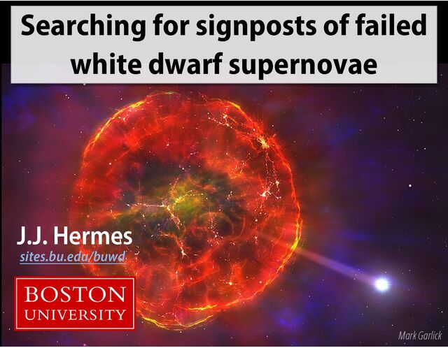 Raddi et al. 2019 JJ Hermes, Boston University | UHIfA | 33 • These are the most metal-rich stars ever found: No H, He detected • All have similar abundances • All have wild fast space motion • 0.20-0.28 M ¤ & 0.16-0.60 R ¤ • Hypothesis: These are the slung-shot remnants of an incomplete Type Iasupernova, ejected from <30-min binary!