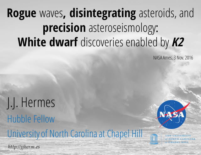 Fuchs, Stephen Fanale U. Warwick: Boris Gaensicke, Paul Chote, Roberto Raddi, Nicola Gentile Fusillo, Dave Armstrong, Pier-Emmanuel Tremblay U. Texas: Keaton J. Bell, Mike Montgomery, Don Winget + Steve Kawaler, Agnes Bischoff-Kim, Alex Gianninas, S.O. Kepler, Alejandra Romero Rogue waves, disintegrating asteroids, and precision asteroseismology: White dwarf discoveries enabled by K2 NASA Ames, 3 Nov. 2016