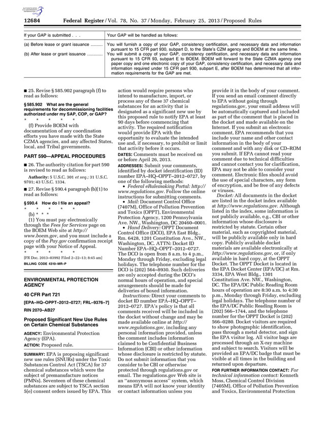February 25, 2013 / Proposed Rules § 721.10653 Hexanedioic acid, polymer with .alpha.-hydro-.omega.- hydroxypoly[oxy(methyl-1,2- ethanediyl)],1,1′-methylenebis[4- isocyanatobenzene], dihydroxydialkyl ether and dialkanol ether (generic). (a) Chemical substance and significant new uses subject to reporting. (1) The chemical substance identified generically as hexanedioic acid, polymer with .alpha.-hydro-.omega.- hydroxypoly[oxy(methyl-1,2- ethanediyl)],1,1′-methylenebis[4- isocyanatobenzene], dihydroxydialkyl ether and dialkanol ether (PMN P–11– 311) is subject to reporting under this section for the significant new uses described in paragraph (a)(2) of this section. (2) The significant new uses are: (i) Protection in the workplace. Requirements as specified in § 721.63 (a)(4), (a)(6)(i), (a)(6)(ii), (a)(6)(v), (b) (concentration set at 0.1 percent), and (c). When determining which persons are reasonably likely to be exposed as required for § 721.63(a)(4), engineering control measures (e.g., enclosure or confinement of the operation, general and local ventilation) or administrative control measures (e.g., workplace policies and procedures) shall be considered and implemented to prevent exposure, where feasible. The following National Institute for Occupational Safety and Health (NIOSH)-certified respirators with an assigned protection factor (APF) of at least 10 meet the requirements of § 721.63(a)(4): (A) NIOSH-certified air-purifying, tight-fitting half-face respirator equipped with N100 (if oil aerosols absent), R100, or P100 filters; (B) NIOSH-certified air-purifying, tight-fitting full-face respirator equipped with N100 (if oil aerosols absent), R100, or P100 filters; (C) NIOSH-certified powered air- purifying respirator equipped with a loose-fitting hood or helmet and high efficiency particulate air (HEPA) filters; (D) NIOSH-certified powered air- purifying respirator equipped with a tight-fitting facepiece (either half-face or full-face) and HEPA filters; and (E) NIOSH-certified supplied-air respirator operated in pressure demand or continuous flow mode and equipped with a hood or helmet, or tight-fitting facepiece (either half-face or full-face). (ii) Industrial, commercial, and consumer activities. Requirements as specified in § 721.80(o). (b) Specific requirements. The provisions of subpart A of this part apply to this section except as modified by this paragraph. (1) Recordkeeping. Recordkeeping requirements as specified in § 721.125 (a), (b), (c), (d), and (i) are applicable to manufacturers, importers, and processors of this substance. (2) Limitations or revocation of certain notification requirements. The provisions of § 721.185 apply to this section. ▪ 19. Add § 721.10654 to subpart E to read as follows: § 721.10654 Hexanedioic acid, polymer with .alpha.-hydro-.omega.- hydroxypoly[oxy(methyl-1,2- ethanediyl)],1,1’- methylenebis[isocyanatobenzene], dihydroxydialkyl ether and dialkanol ether (generic). (a) Chemical substance and significant new uses subject to reporting. (1) The chemical substance identified generically as hexanedioic acid, polymer with .alpha.-hydro-.omega.- hydroxypoly[oxy(methyl-1,2- ethanediyl)],1,1’- methylenebis[isocyanatobenzene], dihydroxydialkyl ether and dialkanol ether (PMN P–11–312) is subject to reporting under this section for the significant new uses described in paragraph (a)(2) of this section. (2) The significant new uses are: (i) Protection in the workplace. Requirements as specified in § 721.63 (a)(4), (a)(6)(i), (a)(6)(ii), (a)(6)(v), (b) (concentration set at 0.1 percent), and (c). When determining which persons are reasonably likely to be exposed as required for § 721.63 (a)(4), engineering control measures (e.g., enclosure or confinement of the operation, general and local ventilation) or administrative control measures (e.g., workplace policies and procedures) shall be considered and implemented to prevent exposure, where feasible. The following National Institute for Occupational Safety and Health (NIOSH)-certified respirators with an assigned protection factor (APF) of at least 10 meet the requirements of § 721.63(a)(4): (A) NIOSH-certified air-purifying, tight-fitting half-face respirator equipped with N100 (if oil aerosols absent), R100, or P100 filters; (B) NIOSH-certified air-purifying, tight-fitting full-face respirator equipped with N100 (if oil aerosols absent), R100, or P100 filters; (C) NIOSH-certified powered air- purifying respirator equipped with a loose-fitting hood or helmet and high efficiency particulate air (HEPA) filters; (D) NIOSH-certified powered air- purifying respirator equipped with a tight-fitting facepiece (either half-face or full-face) and HEPA filters; and (E) NIOSH-certified supplied-air respirator operated in pressure demand or continuous flow mode and equipped with a hood or helmet, or tight-fitting facepiece (either half-face or full-face). (ii) Industrial, commercial, and consumer activities. Requirements as specified in § 721.80(o). (b) Specific requirements. The provisions of subpart A of this part apply to this section except as modified by this paragraph. (1) Recordkeeping. Recordkeeping requirements as specified in § 721.125 (a), (b), (c), (d), and (i) are applicable to manufacturers, importers, and processors of this substance. (2) Limitations or revocation of certain notification requirements. The provisions of § 721.185 apply to this section. ▪ 20. Add § 721.10655 to subpart E to read as follows: § 721.10655 Hexanedioic acid, polymer with .alpha.-hydro-.omega.-hydroxypoly [oxy(methyl-1,2-ethanediyl)],1,1’- methylenebis[4-isocyanatobenzene], dihydroxydialkyl ether, reaction products with dialkylcarbinol (generic). (a) Chemical substance and significant new uses subject to reporting. (1) The chemical substance identified generically as hexanedioic acid, polymer with .alpha.-hydro-.omega.- hydroxypoly[oxy(methyl-1,2- ethanediyl)],1,1’-methylenebis[4- isoc