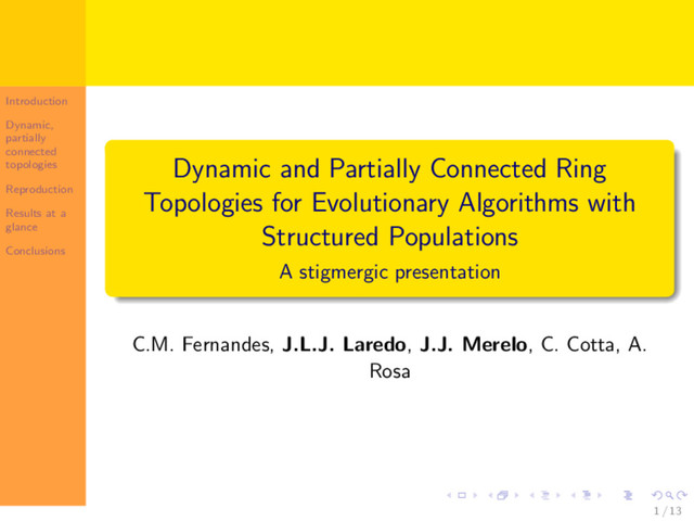 Conclusions Dynamic and Partially Connected Ring Topologies for Evolutionary Algorithms with Structured Populations A stigmergic presentation C.M. Fernandes, J.L.J. Laredo, J.J. Merelo, C. Cotta, A. Rosa 1 / 13