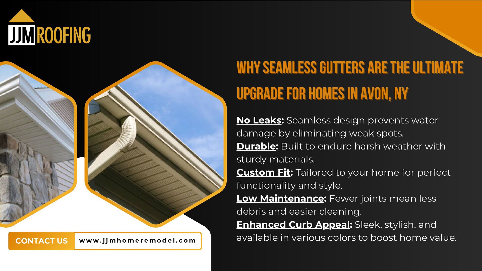 Looking to protect your home from water damage? JJM Roofing & Seamless Gutters offers seamless gutters in Avon, NY designed to prevent leaks, reduce maintenance, and add style. Contact us for custom-fitted solutions and expert installation for a worry-free home upgrade!