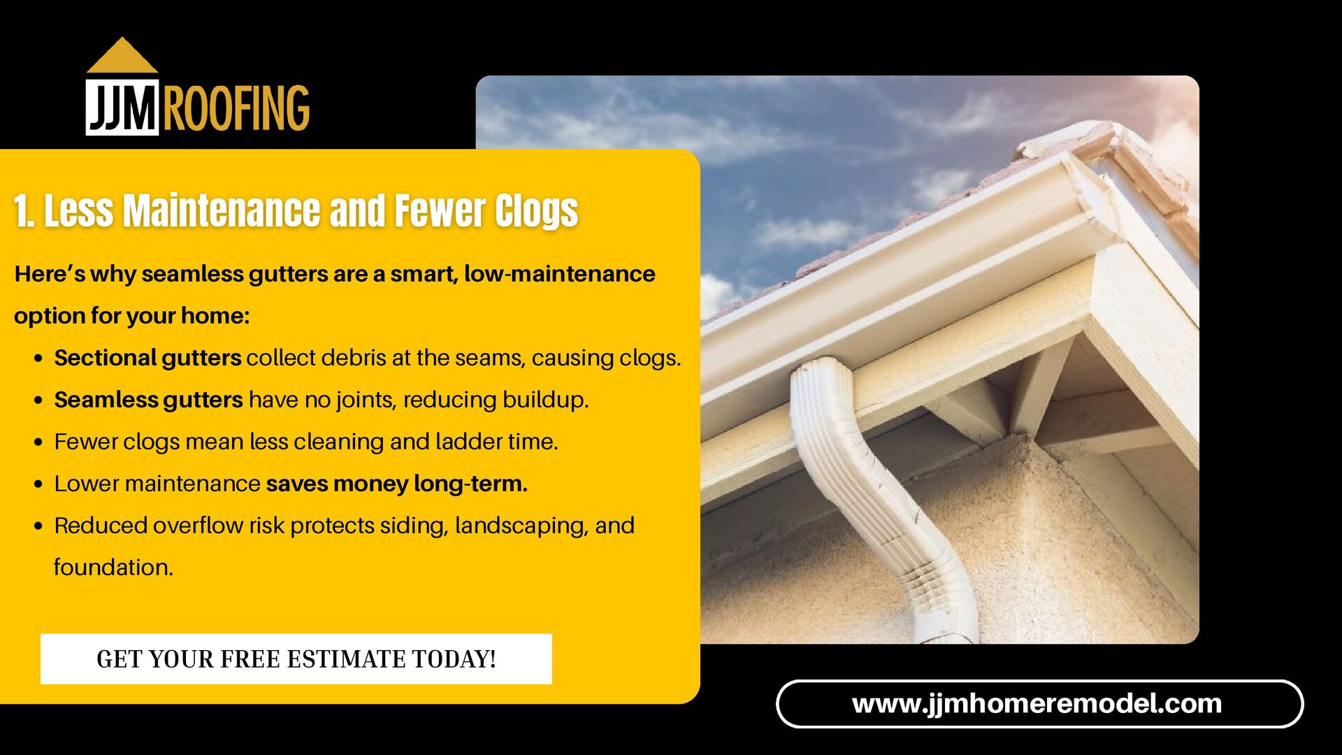 your home: Sectional gutters collect debris at the seams, causing clogs. Seamless gutters have no joints, reducing buildup. Fewer clogs mean less cleaning and ladder time. Lower maintenance saves money long-term. Reduced overflow risk protects siding, landscaping, and foundation. www.jjmhomeremodel.com GET YOUR FREE ESTIMATE TODAY!