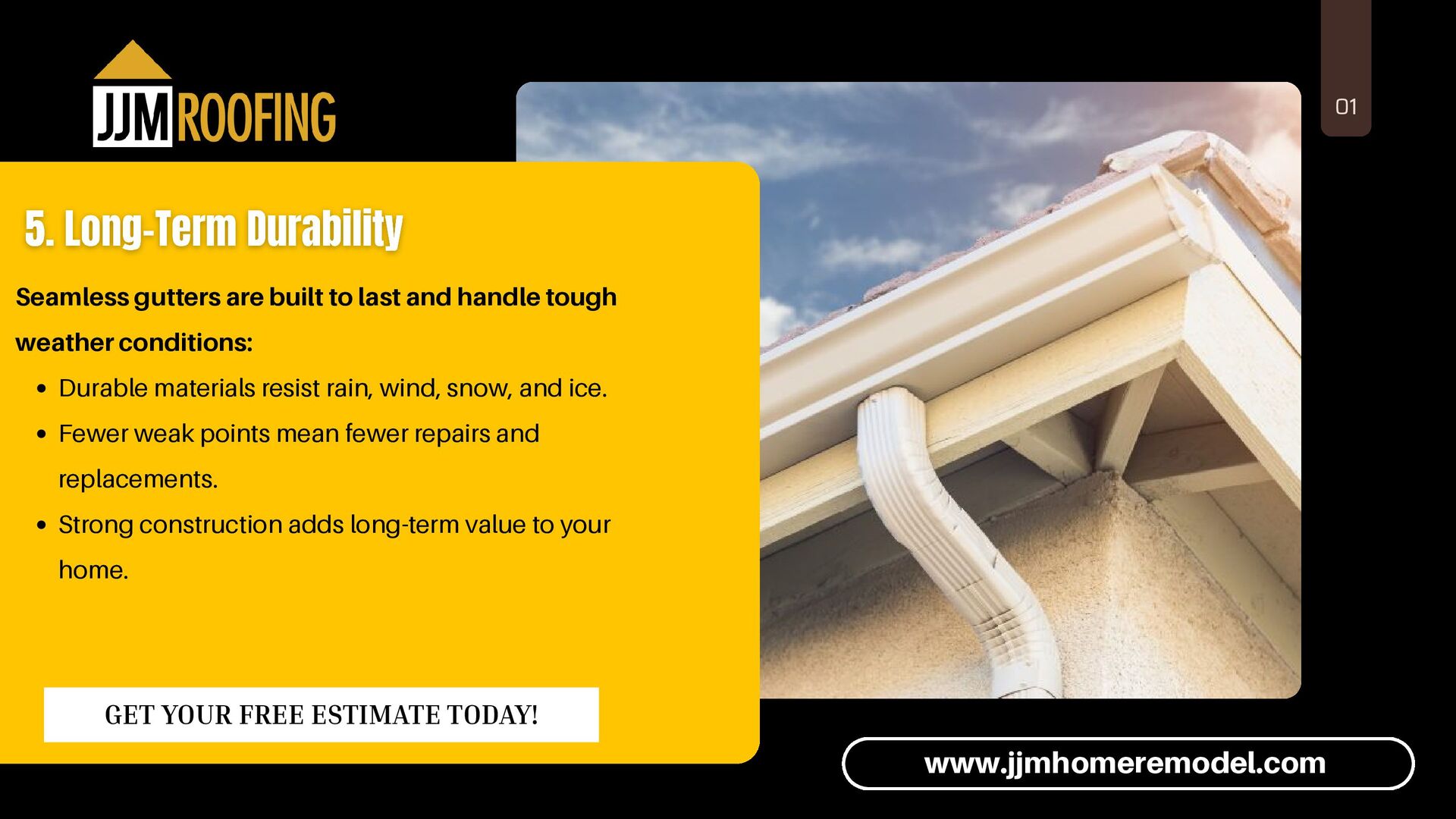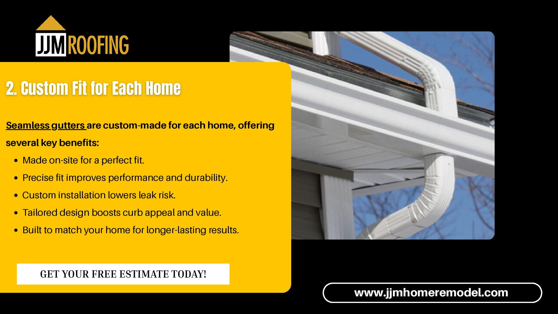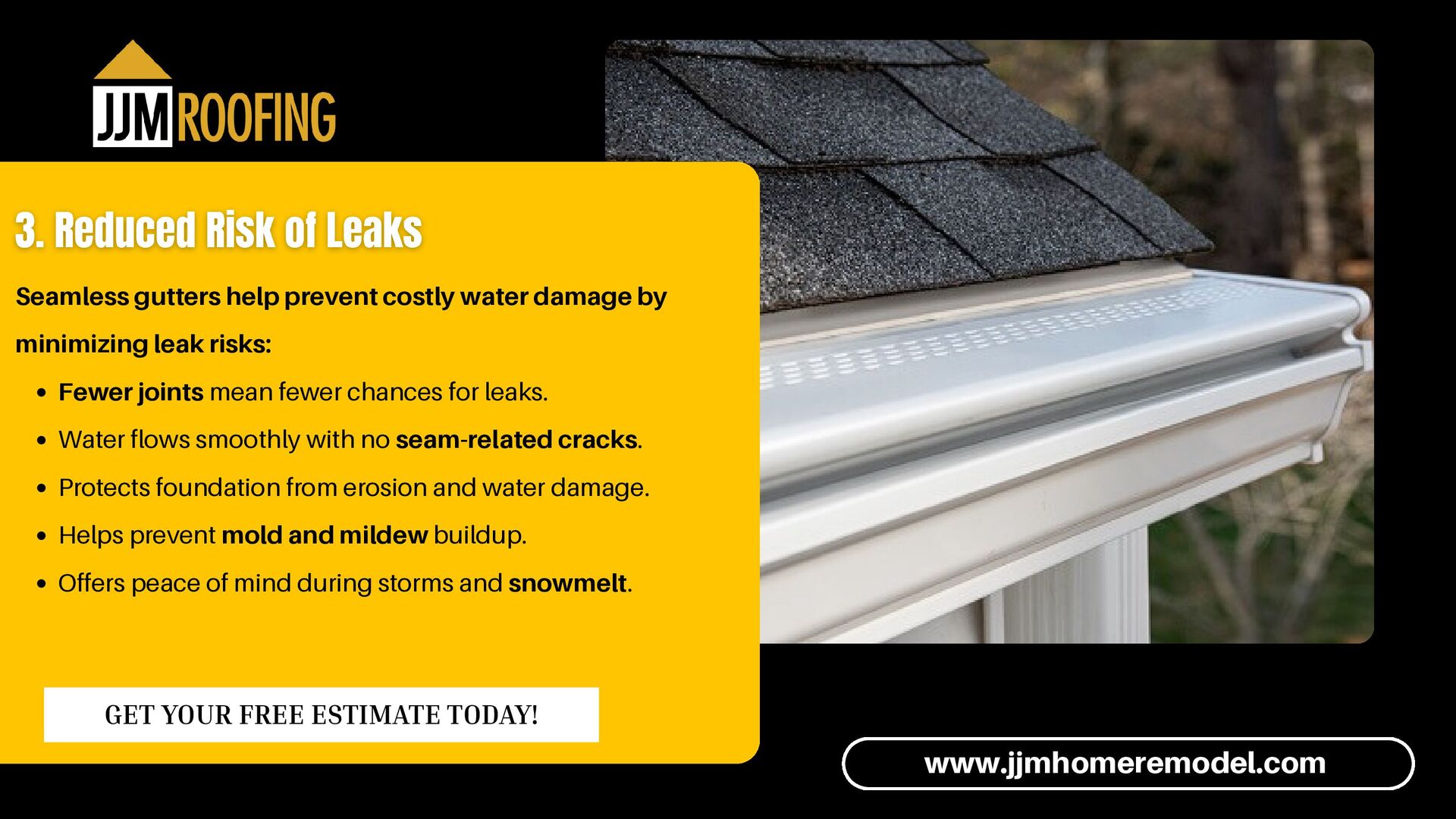 risks: Fewer joints mean fewer chances for leaks. Water flows smoothly with no seam-related cracks. Protects foundation from erosion and water damage. Helps prevent mold and mildew buildup. Offers peace of mind during storms and snowmelt. www.jjmhomeremodel.com GET YOUR FREE ESTIMATE TODAY!