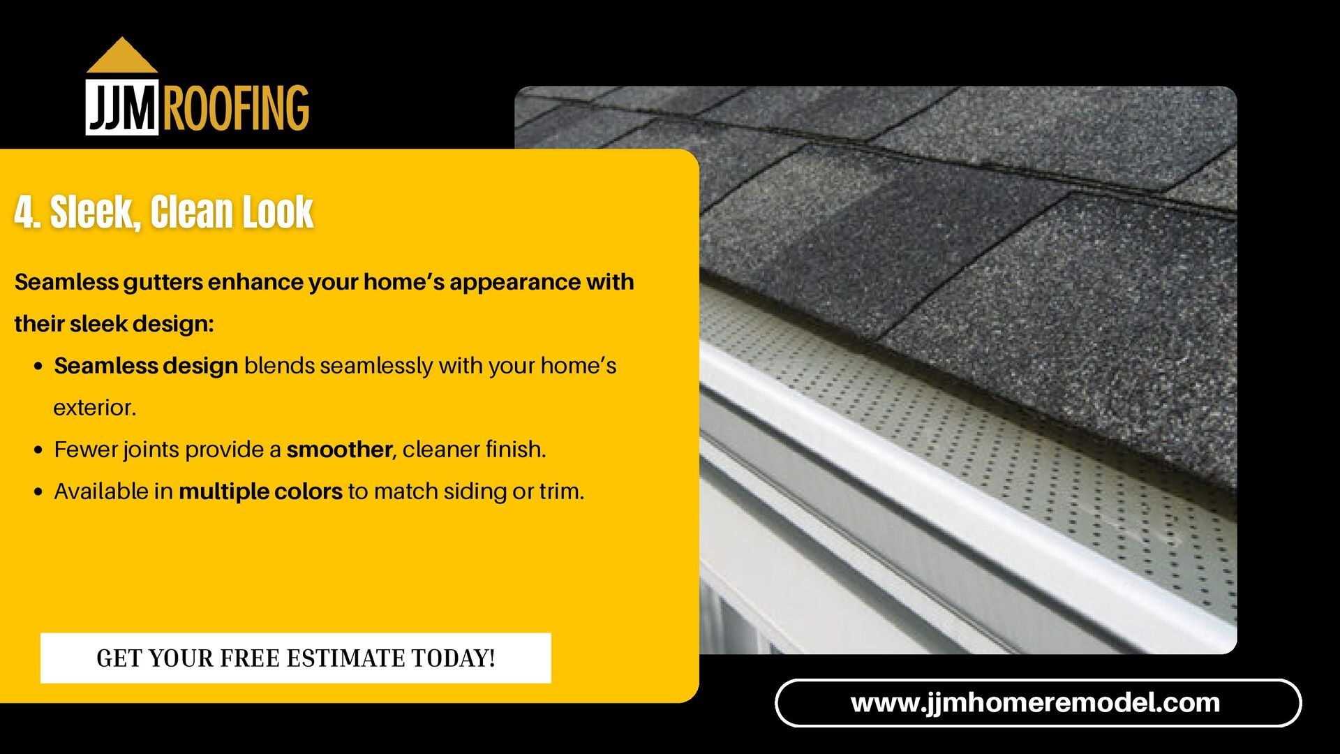 Seamless design blends seamlessly with your home’s exterior. Fewer joints provide a smoother, cleaner finish. Available in multiple colors to match siding or trim. www.jjmhomeremodel.com GET YOUR FREE ESTIMATE TODAY!