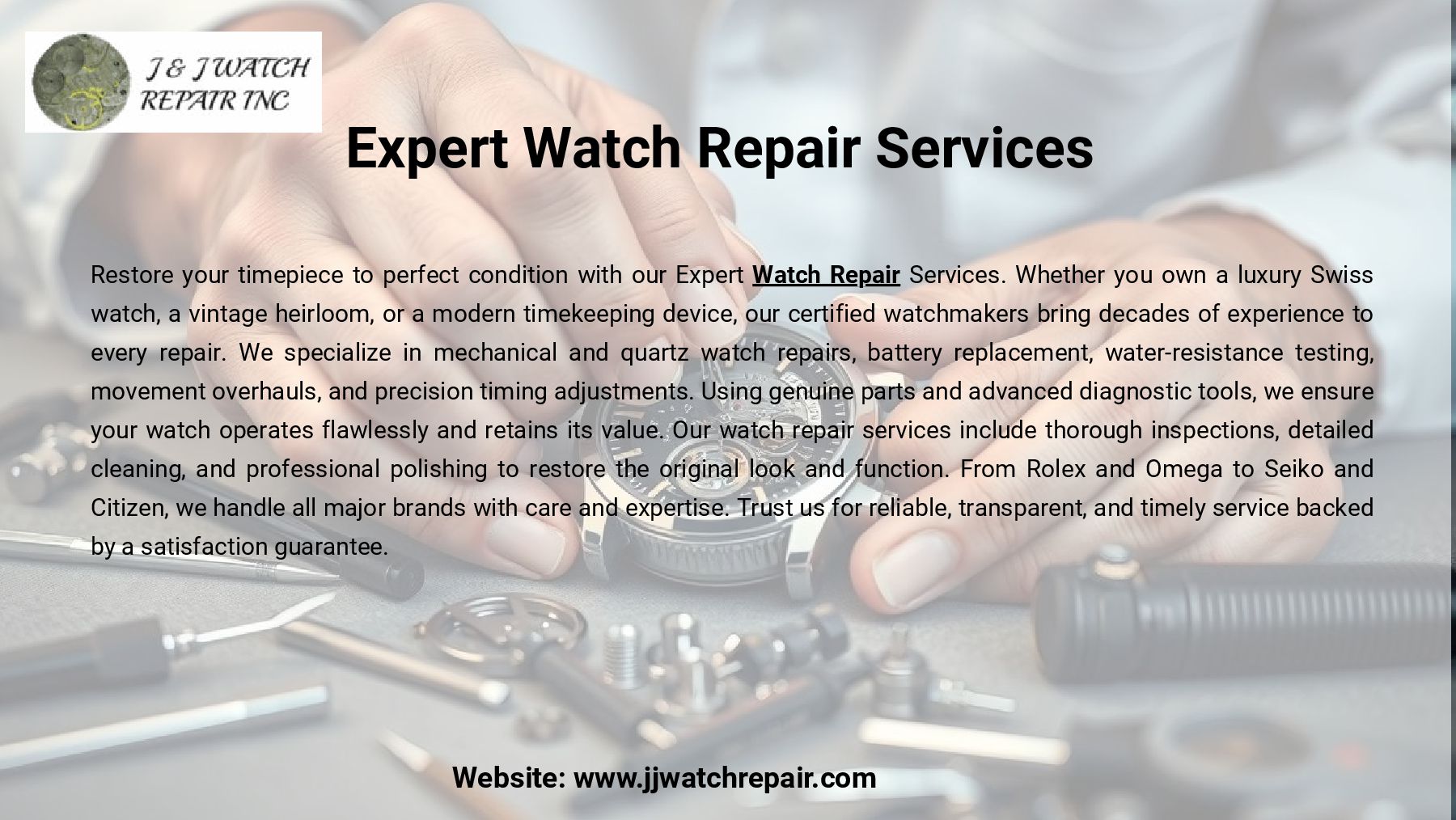 means trusting skilled professionals with years of hands-on experience in restoring all types of timepieces. We offer precision, reliability, and transparency in every repair—from luxury brands to everyday watches. Our certified watchmakers use genuine parts, advanced tools, and meticulous techniques to ensure optimal performance and long-term durability. Every repair includes a thorough inspection, detailed diagnostics, and quality assurance. With quick turnaround times, competitive pricing, and personalized service, we go beyond expectations. Your watch is valuable—entrust it to experts who treat every piece with the care and respect it deserves. All our repairs come with a warranty, providing you with peace of mind and assurance of quality. Our team comprises highly trained and certified watchmakers with extensive experience in luxury timepieces. Genuine Parts We use only authentic manufacturer parts to ensure the longevity and performance of your Certified Technicians Guaranteed Work We use only authentic manufacturer parts to ensure the longevity and performance of your watch. Genuine Parts Website: www.jjwatchrepair.com