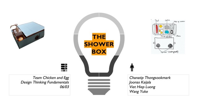 common shower, Shower Boxis a personalized shower basket, which has the benefit of making public shower experience feel like your own private one. Unlike traditional shower equipment, our product has the effects of simplicity and positive mood associated to music.” 0. Title Hi all, We are team chicken and egg and we are here to tell, how eve na crampy, public shower experience can feel relaxing and enjoyable 1. Prototype By researching the needs of university students living in dorms, we have devised a new appliance called ShowerBox. Simple is beautiful and that’s exactly what ShowerBox offers: it keeps all your accessories for shower coordinated and helps you enjoy with your favorite songs 2. Problem The problem here is a common one for people living in shared space. You need to carry all your shower amenities from your room to the shower including shampoo, towel,clothes etc. You go there only to realise you forgot something, After a long day, getting yourself clean is just one of those mandatory chores. 3. Unique Insight By simplifying the preparations needed for showering, and adding some personal aspects the whole experience can reduce stress with simple tricks and affordably for students. 4. Solution Thus, ShowerBox, is your portable tool when shared space is scarce. A waterproof box with unique compartments keeps all your items and clothes well-organized and are always easy to move. Not only is it organized, but comes with speakers to switch between your favorite songs or relaxing tunes to make showering enjoyable such as in a private spa 5. Voice of User After testing our initial version with potential customers, we improved the usability of different shower products by changing the design of our lid From the user test we also realised that simplicity and relaxation are two side sof the same coin. 6. Future Works During our next phase we will introduce sample boxes to Japan’s biggest dorms to improve our first models and get more customer feedback 7. Call to Action ShowerBox is just the beginning of functional shared living. Join us with our quest of creating sustainable everyday tools and create the life you want for students to come! Thank you