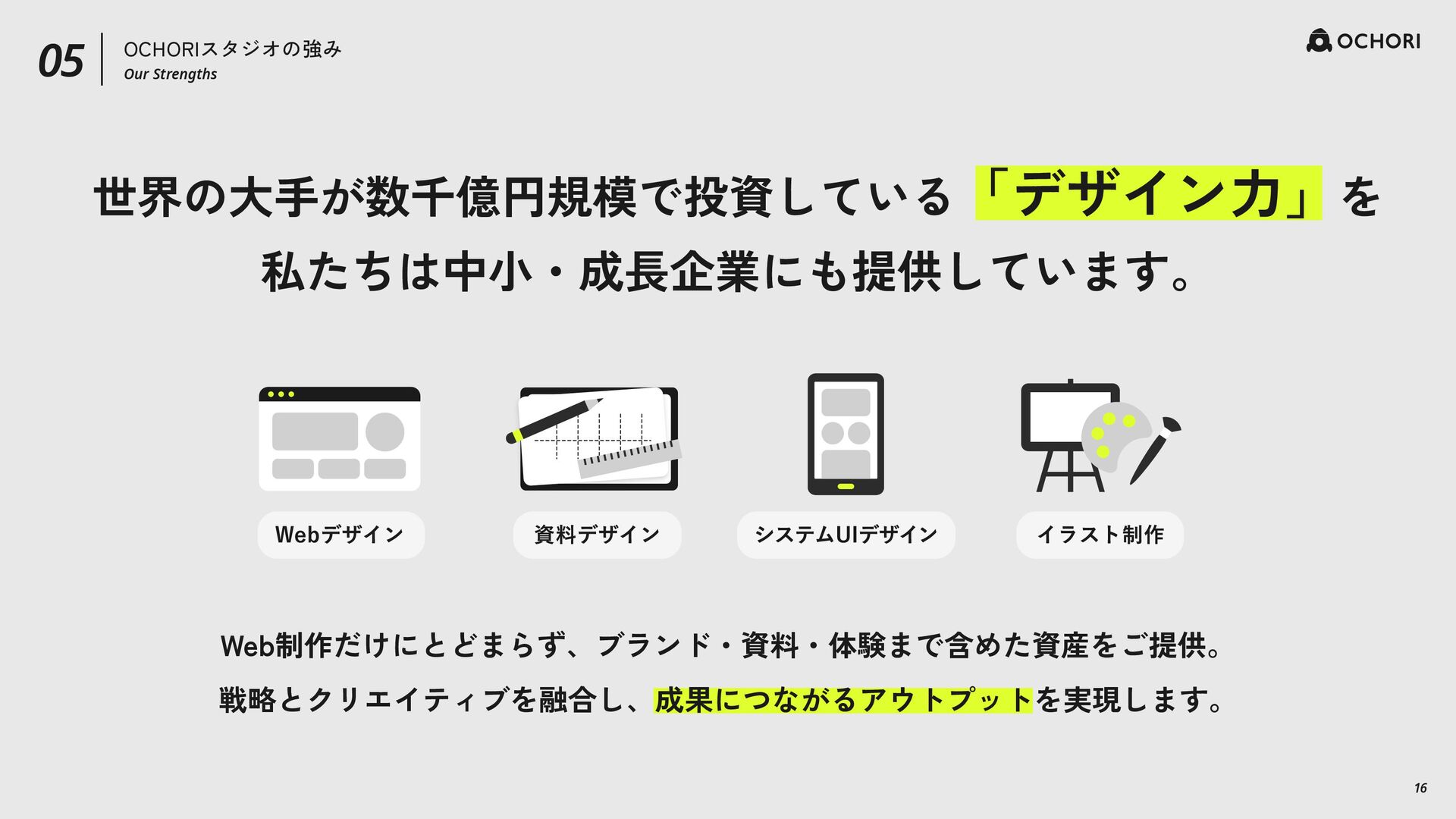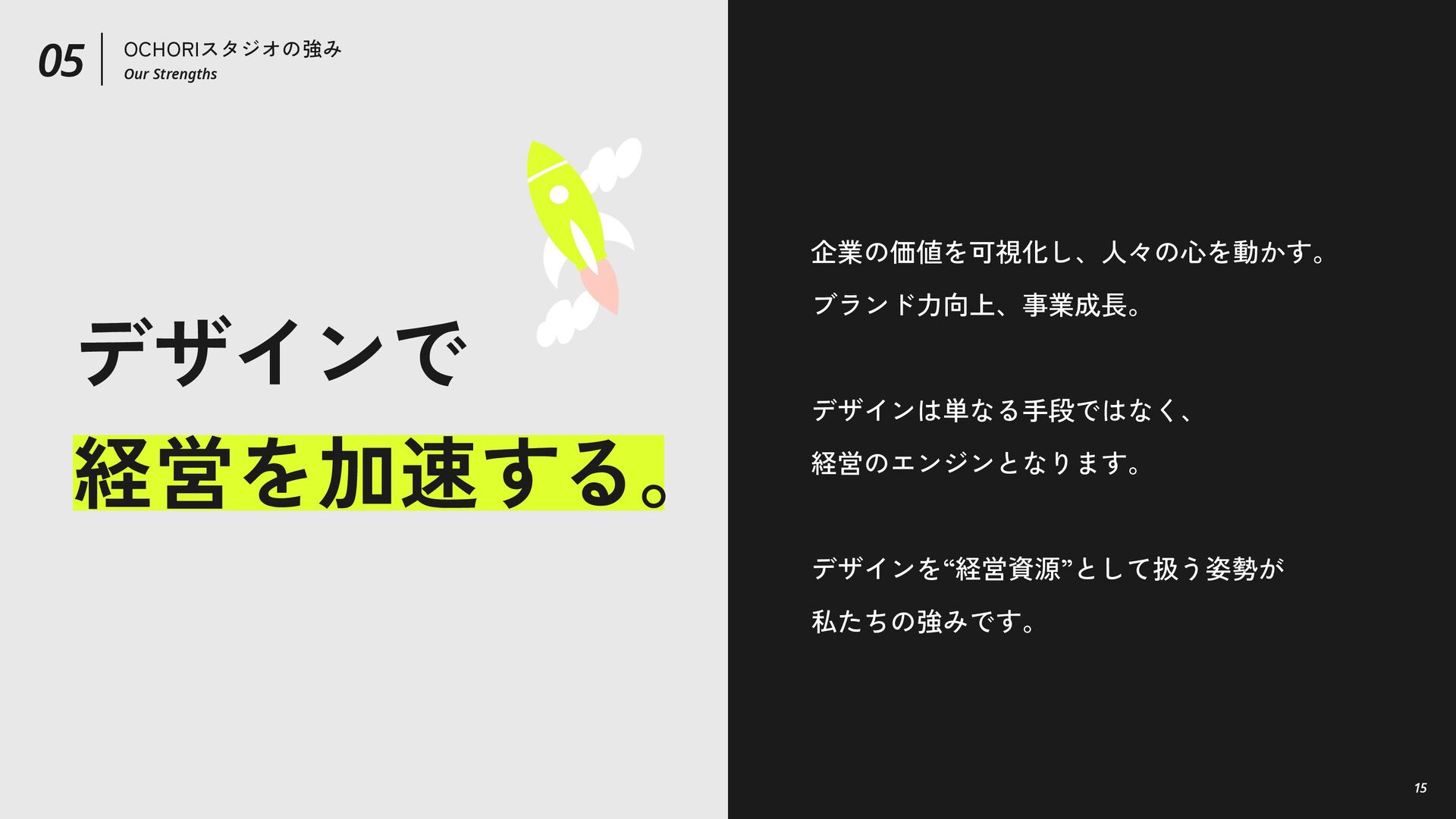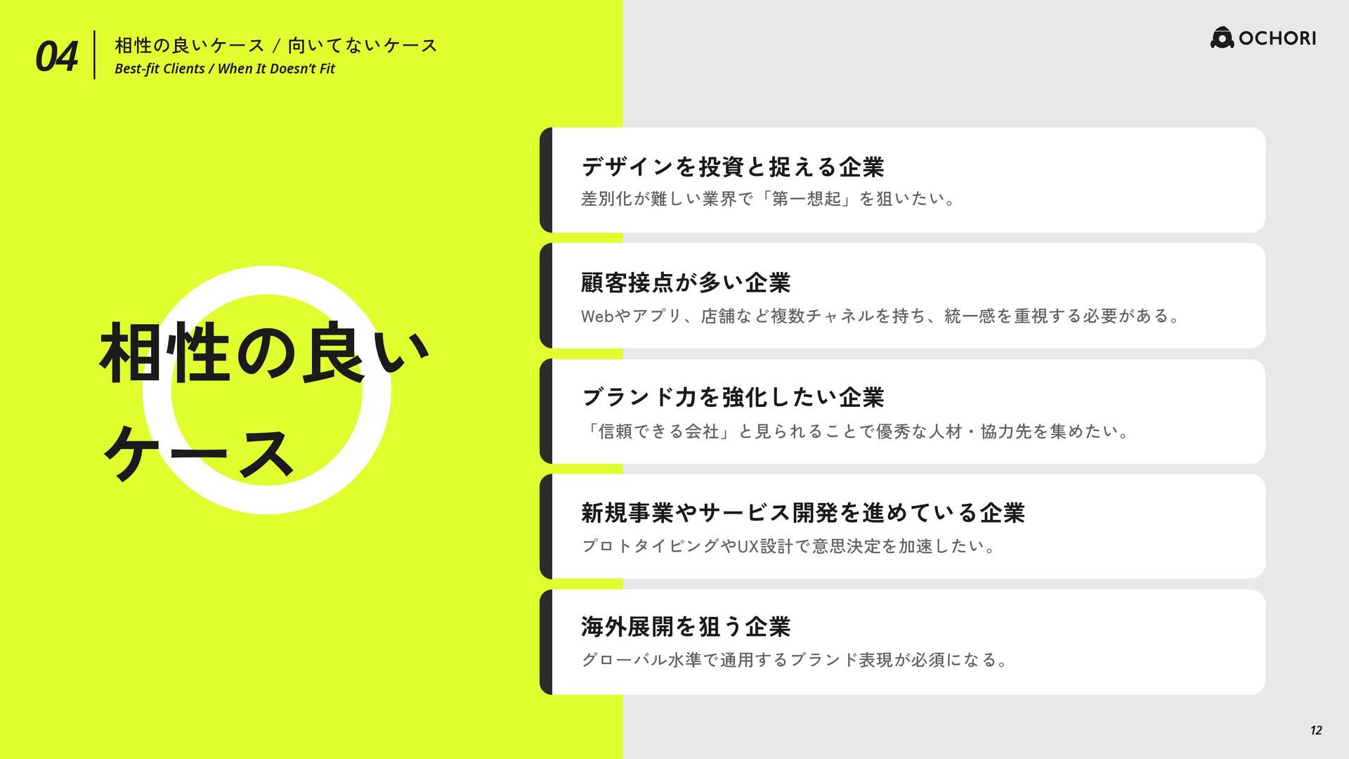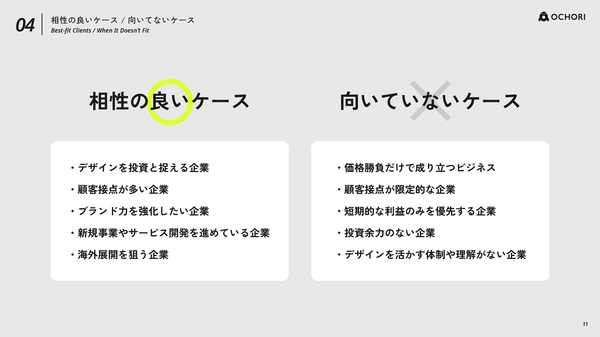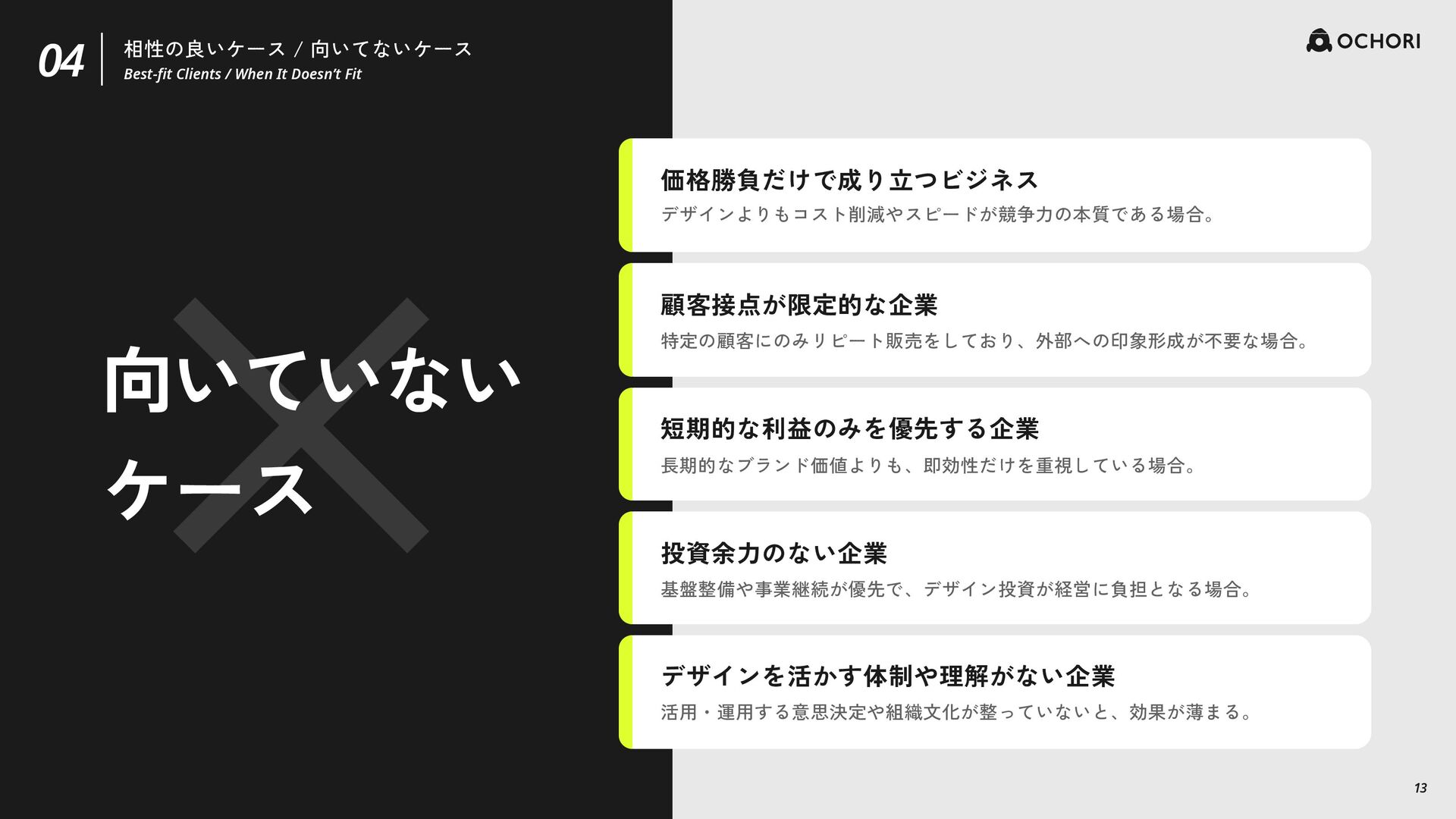 04 価格勝負だけで成り立つビジネス 顧客接点が限定的な企業 短期的な利益のみを優先する企業 投資余力のない企業 デザインを活かす体制や理解がない企業 デザインよりもコスト削減やスピードが競争力の本質である場合。 特定の顧客にのみリピート販売をしており、外部への印象形成が不要な場合。 長期的なブランド価値よりも、即効性だけを重視している場合。 基盤整備や事業継続が優先で、デザイン投資が経営に負担となる場合。 活用・運用する意思決定や組織文化が整っていないと、効果が薄まる。 13 向いていない ケース