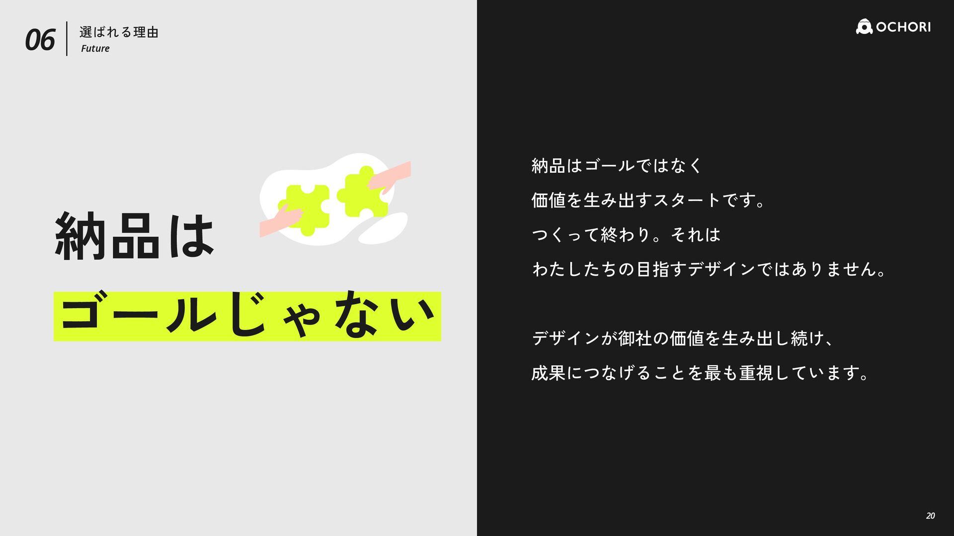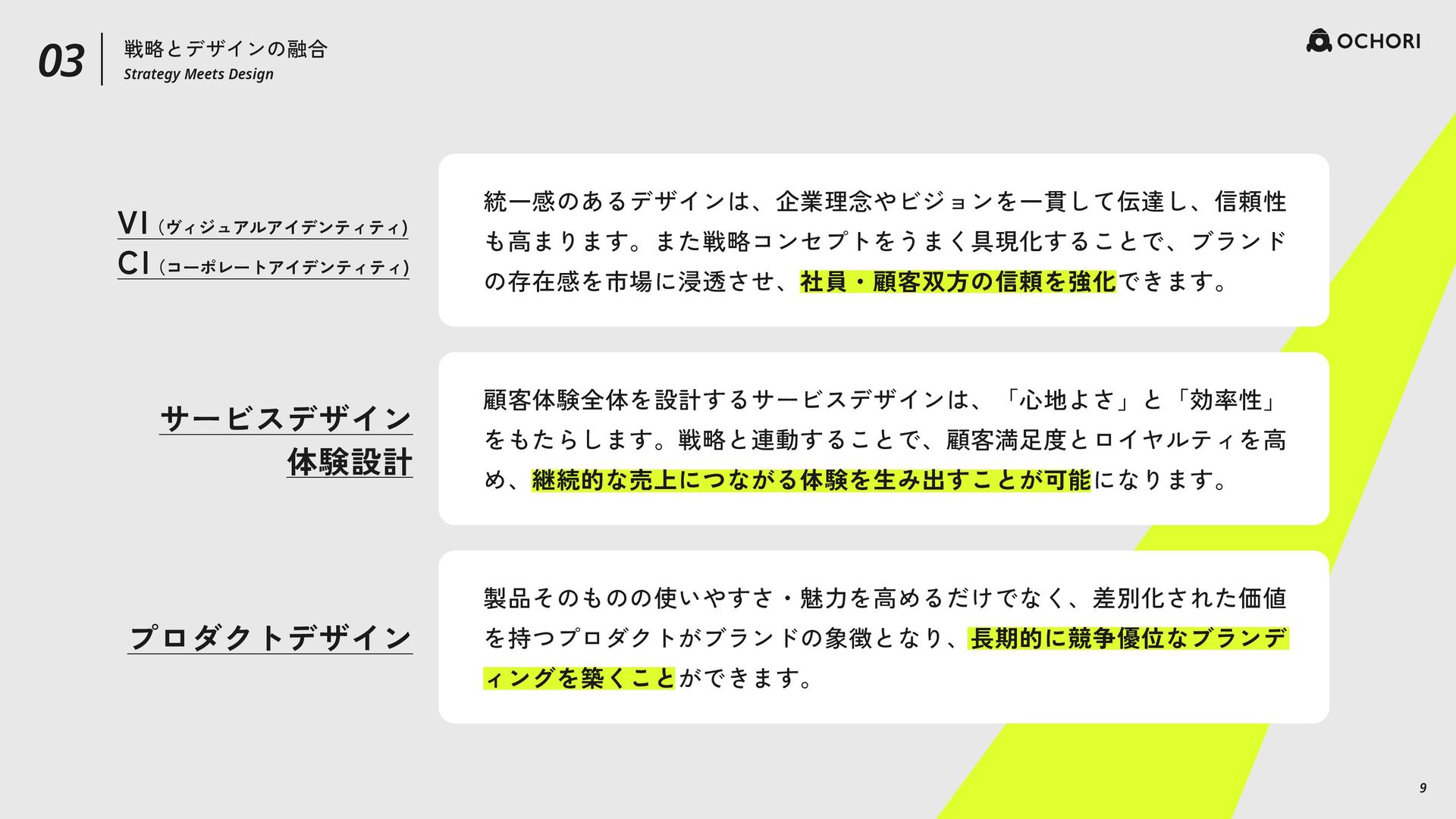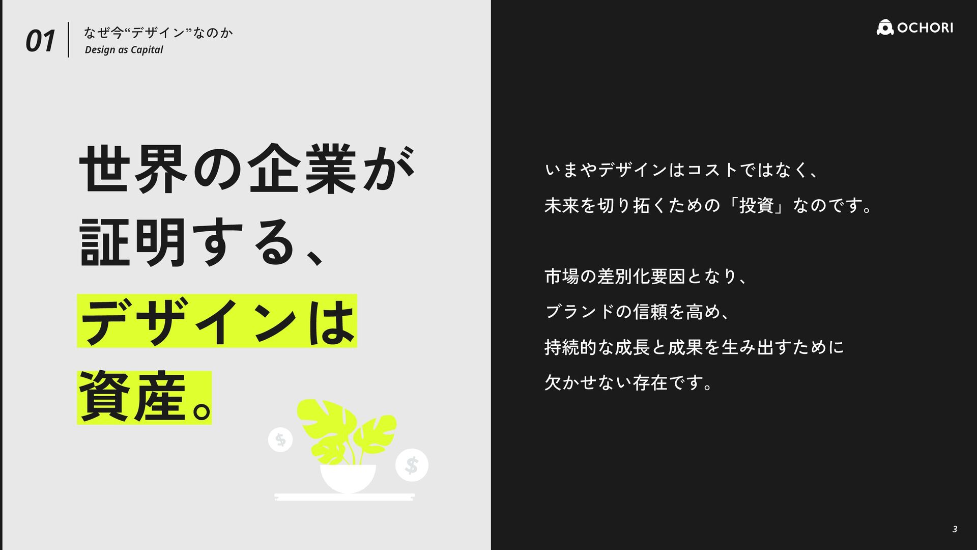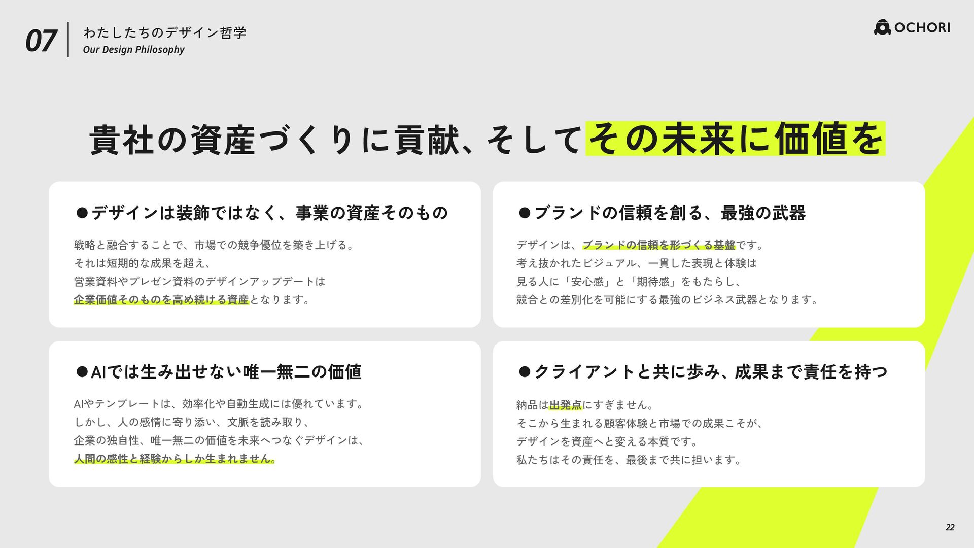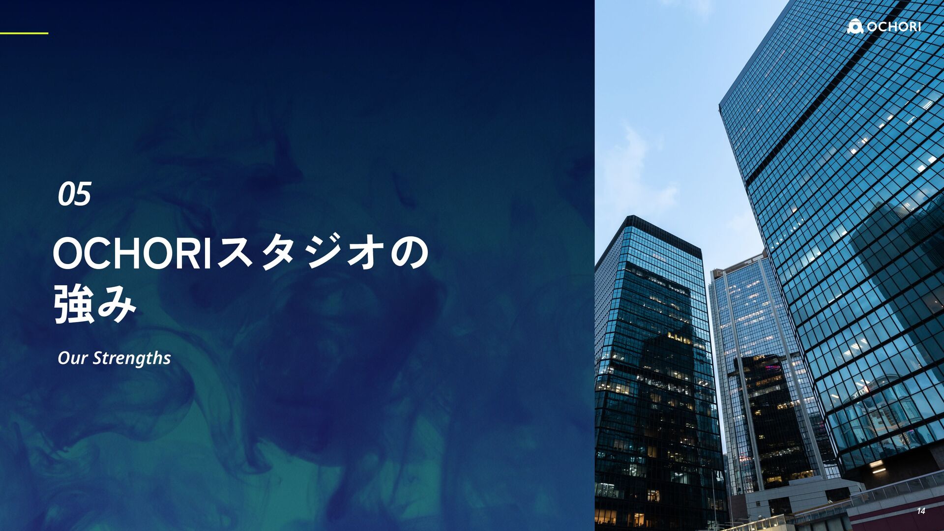 04 価格勝負だけで成り立つビジネス 顧客接点が限定的な企業 短期的な利益のみを優先する企業 投資余力のない企業 デザインを活かす体制や理解がない企業 デザインよりもコスト削減やスピードが競争力の本質である場合。 特定の顧客にのみリピート販売をしており、外部への印象形成が不要な場合。 長期的なブランド価値よりも、即効性だけを重視している場合。 基盤整備や事業継続が優先で、デザイン投資が経営に負担となる場合。 活用・運用する意思決定や組織文化が整っていないと、効果が薄まる。 13 向いていない ケース