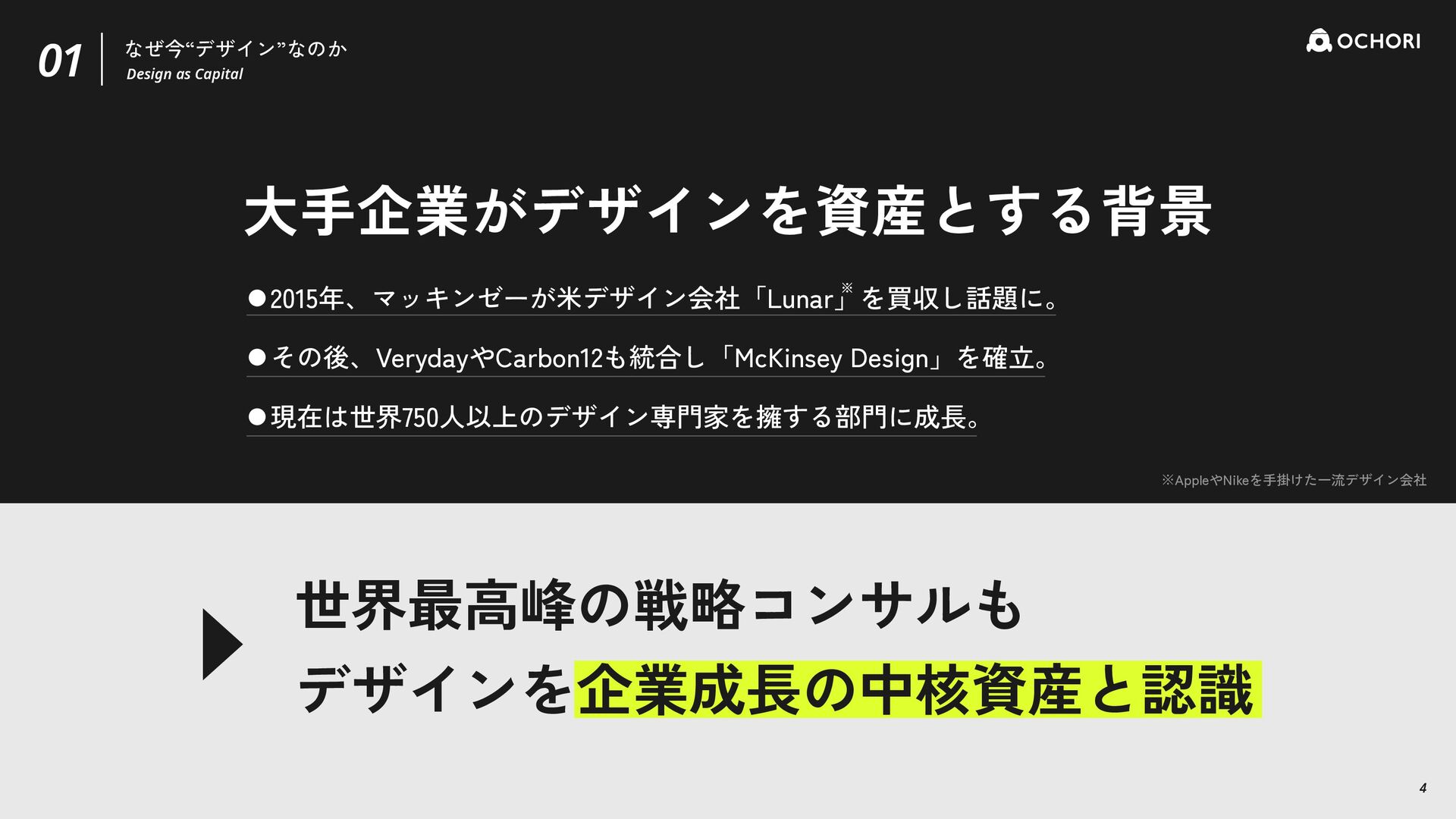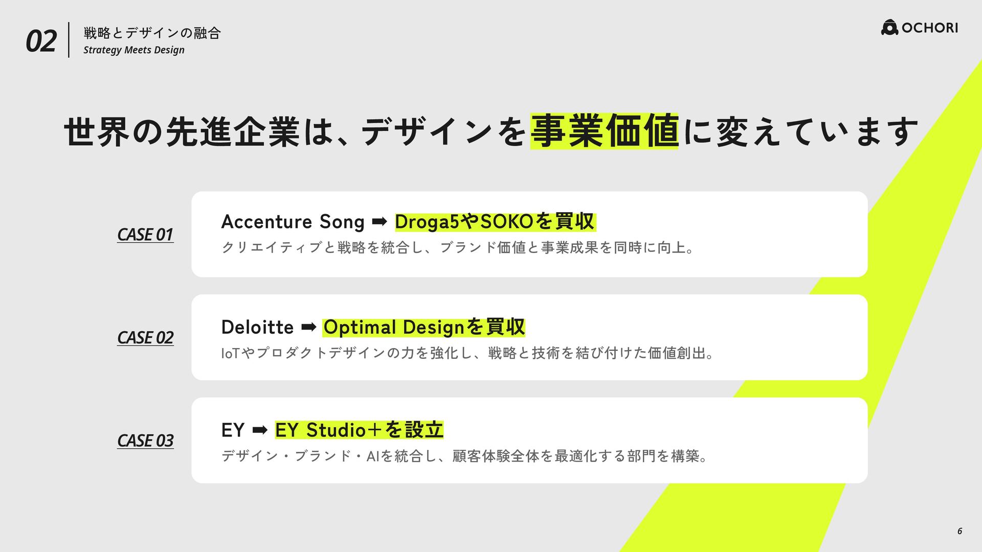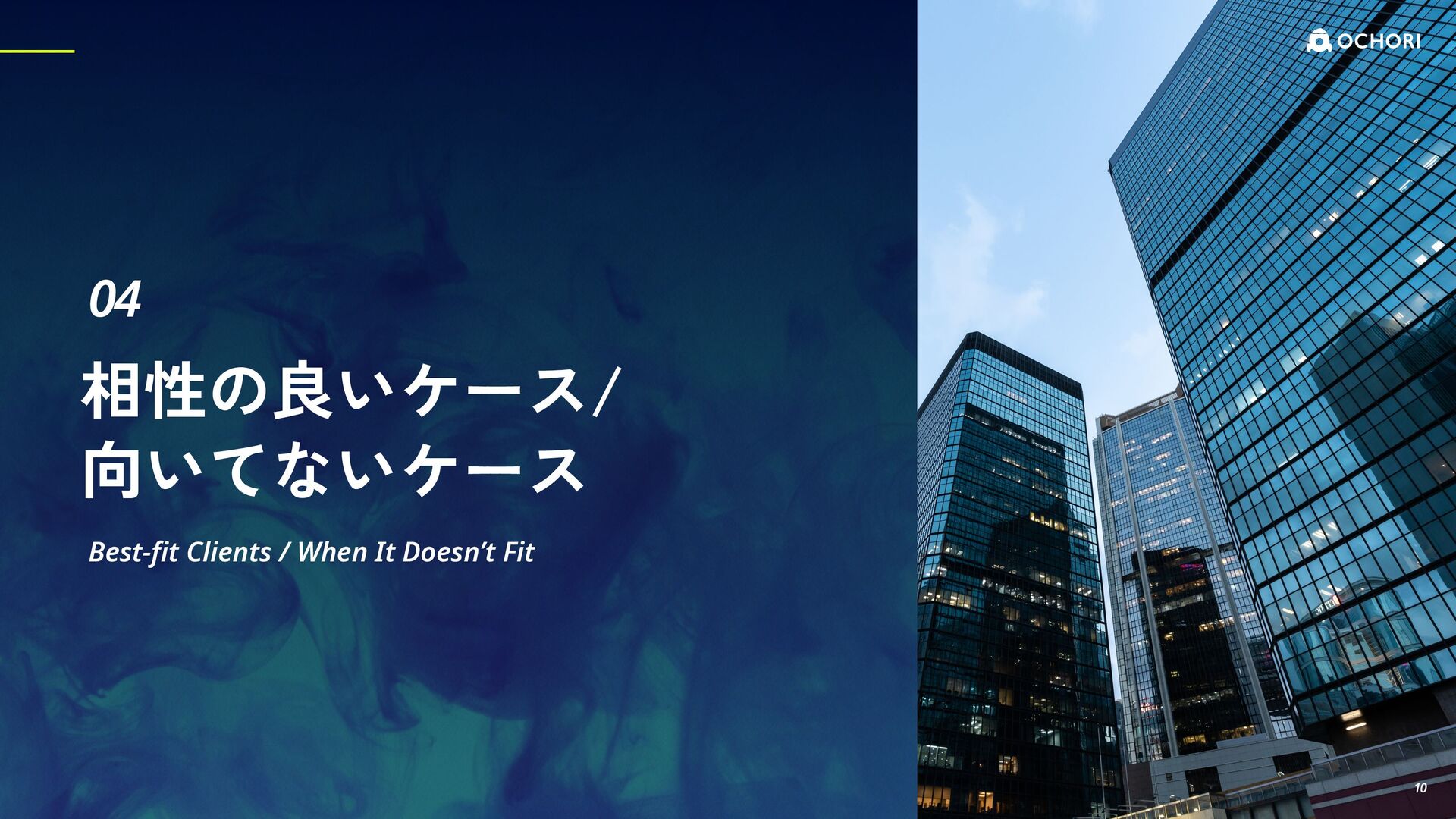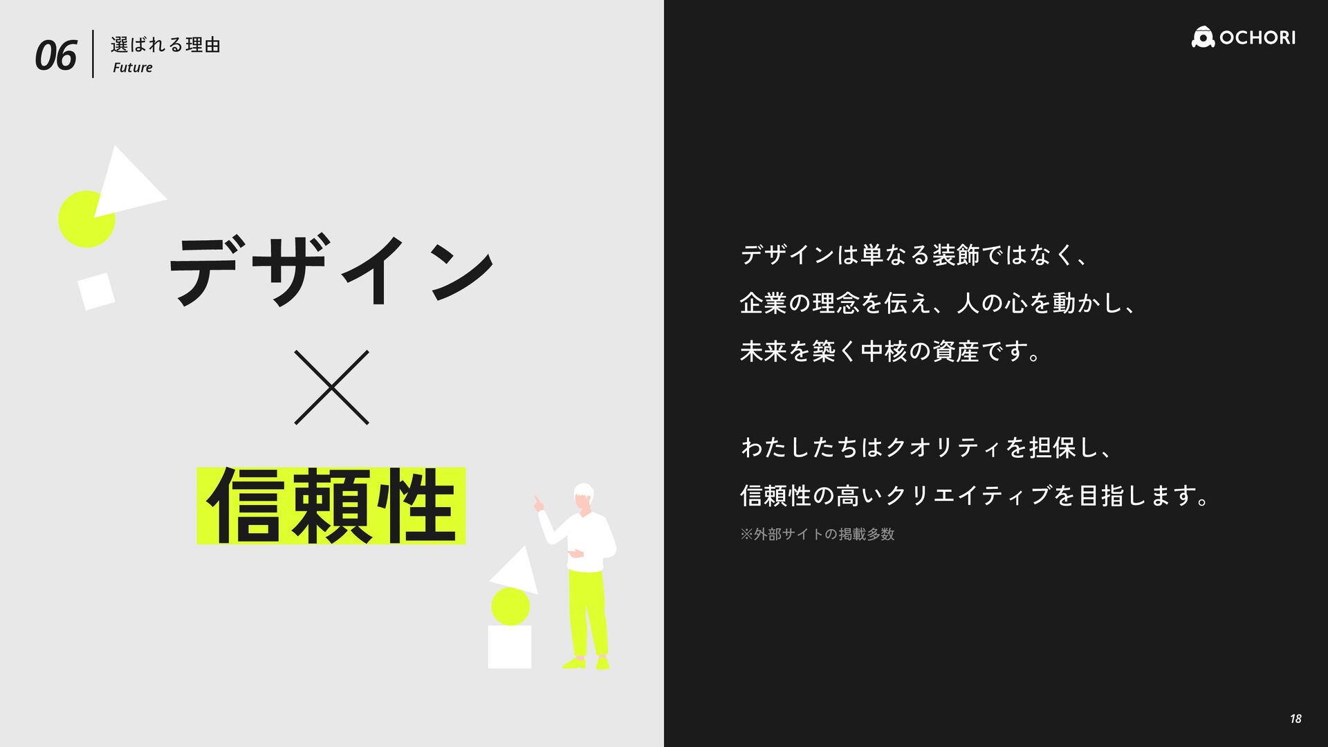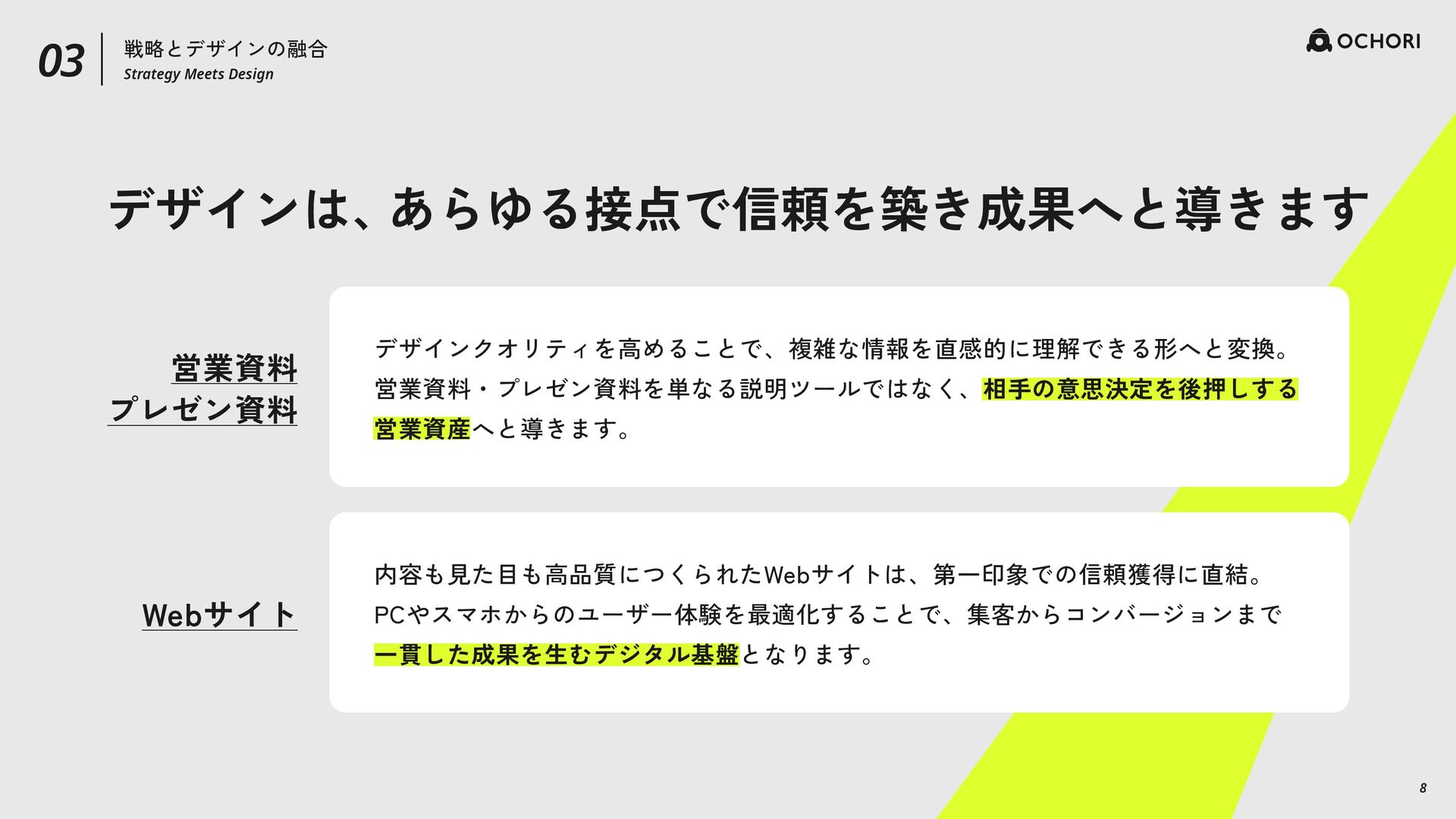 04 価格勝負だけで成り立つビジネス 顧客接点が限定的な企業 短期的な利益のみを優先する企業 投資余力のない企業 デザインを活かす体制や理解がない企業 デザインよりもコスト削減やスピードが競争力の本質である場合。 特定の顧客にのみリピート販売をしており、外部への印象形成が不要な場合。 長期的なブランド価値よりも、即効性だけを重視している場合。 基盤整備や事業継続が優先で、デザイン投資が経営に負担となる場合。 活用・運用する意思決定や組織文化が整っていないと、効果が薄まる。 13 向いていない ケース