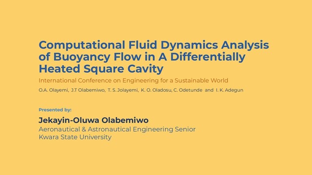 Heated Square Cavity O.A. Olayemi, J.T Olabemiwo, T. S. Jolayemi, K. O. Oladosu, C. Odetunde and I. K. Adegun International Conference on Engineering for a Sustainable World Presented by: Jekayin-Oluwa Olabemiwo Aeronautical & Astronautical Engineering Senior Kwara State University