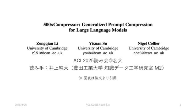 • 選定理由 • 対話やRAGなどでプロンプトが⻑くなる中 圧縮技術の重要性が増すと考えたため 2025/9/26 ACL2025読み会@名⼤ 2