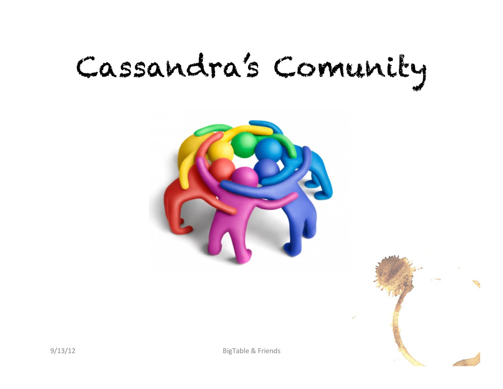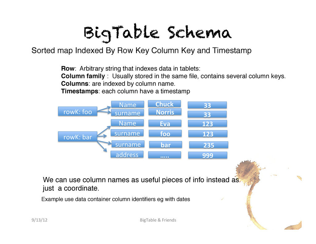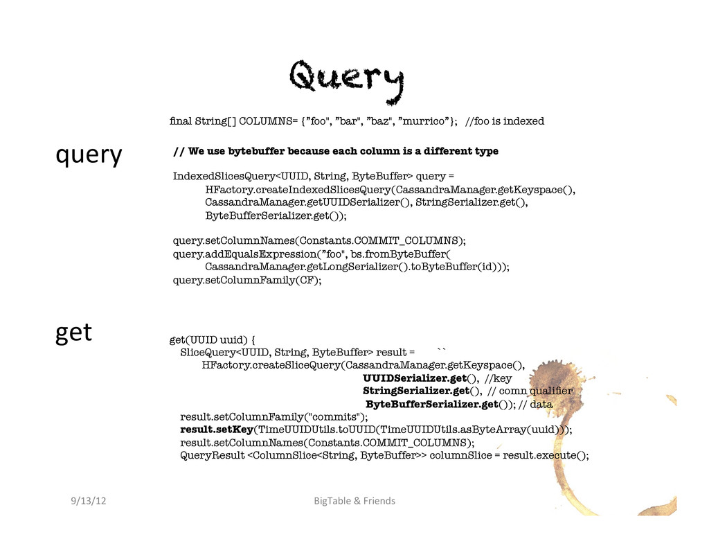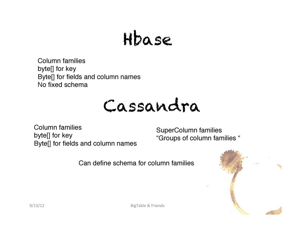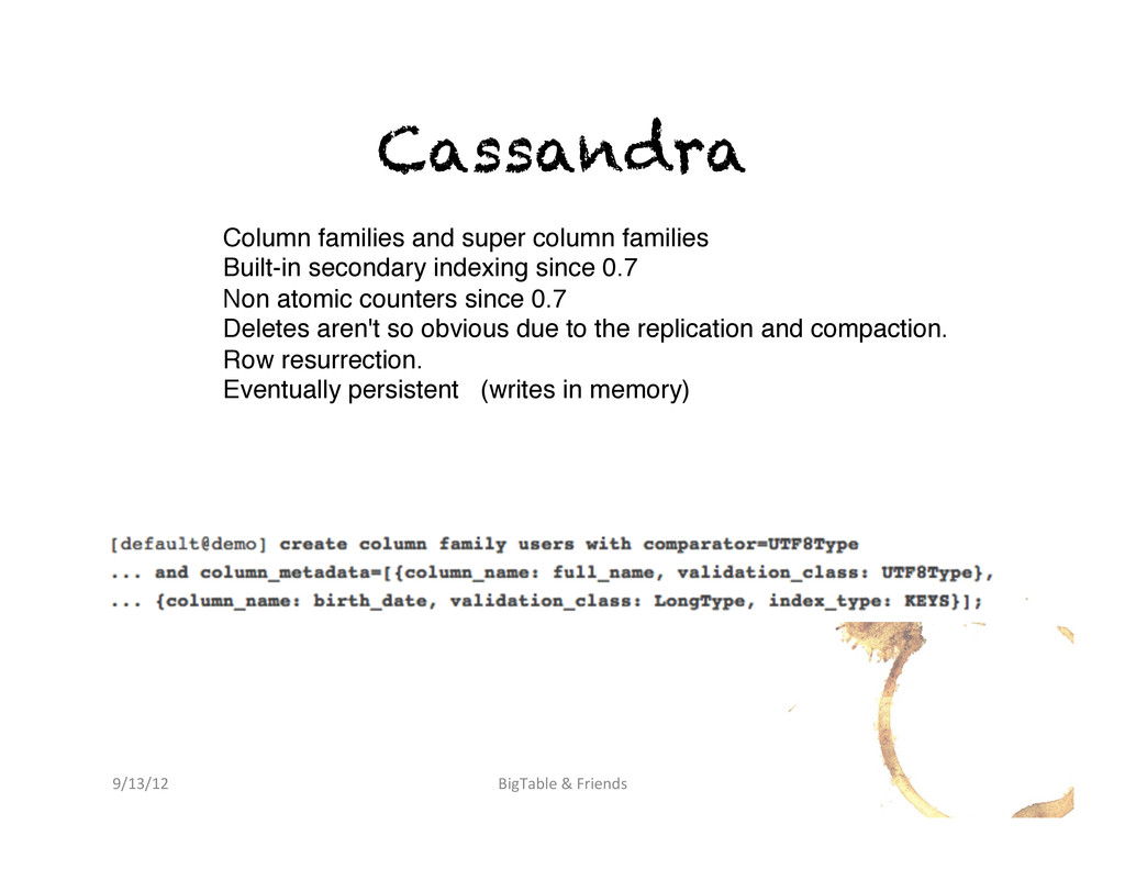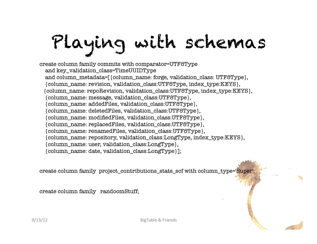 key_validation_class=TimeUUIDType and column_metadata=[{column_name: forge, validation_class: UTF8Type}, {column_name: revision, validation_class:UTF8Type, index_type:KEYS}, {column_name: repoRevision, validation_class:UTF8Type, index_type:KEYS}, {column_name: message, validation_class:UTF8Type}, {column_name: addedFiles, validation_class:UTF8Type}, {column_name: deletedFiles, validation_class:UTF8Type}, {column_name: modifiedFiles, validation_class:UTF8Type}, {column_name: replacedFiles, validation_class:UTF8Type}, {column_name: renamedFiles, validation_class:UTF8Type}, {column_name: repository, validation_class:LongType, index_type:KEYS}, {column_name: user, validation_class:LongType}, {column_name: date, validation_class:LongType}]; create column family project_contributions_stats_scf with column_type='Super'; create column family randoomStuff; 9/13/12 BigTable & Friends