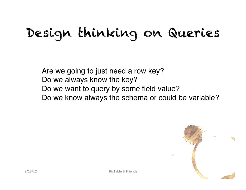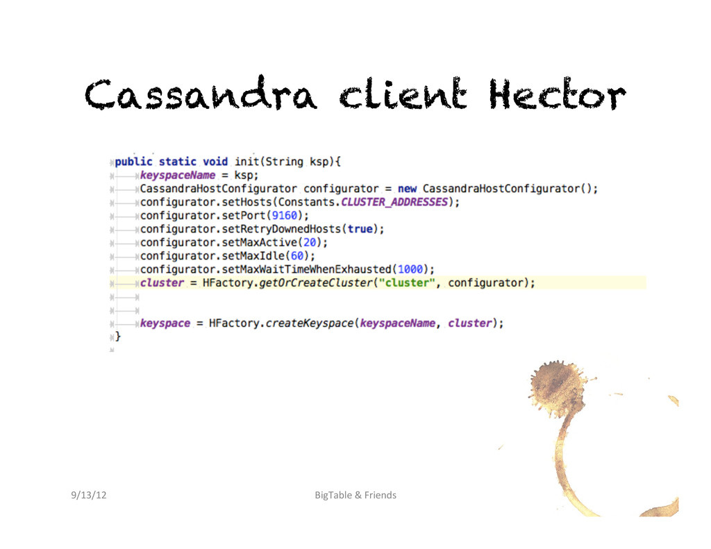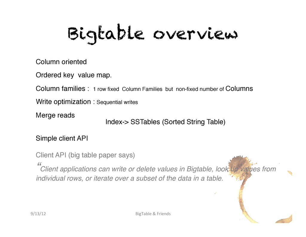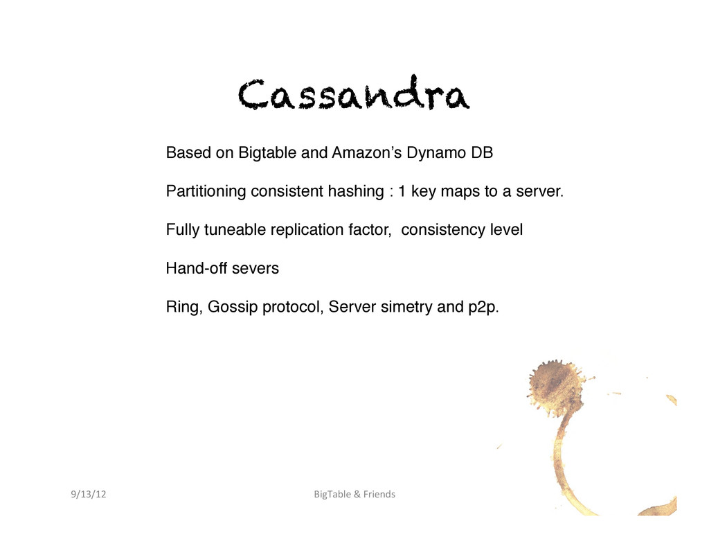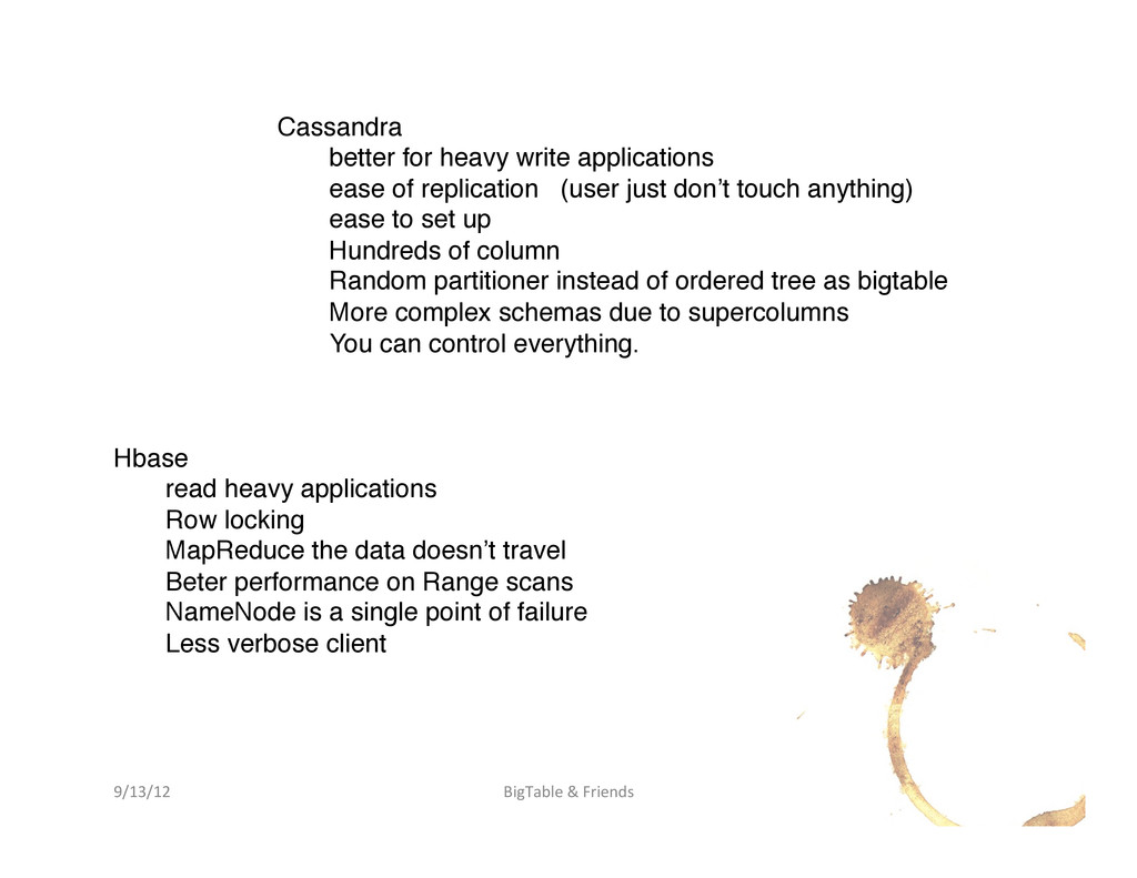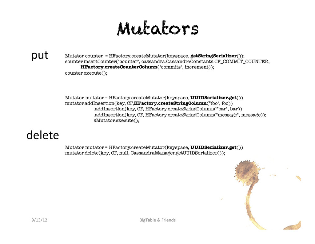 key_validation_class=TimeUUIDType and column_metadata=[{column_name: forge, validation_class: UTF8Type}, {column_name: revision, validation_class:UTF8Type, index_type:KEYS}, {column_name: repoRevision, validation_class:UTF8Type, index_type:KEYS}, {column_name: message, validation_class:UTF8Type}, {column_name: addedFiles, validation_class:UTF8Type}, {column_name: deletedFiles, validation_class:UTF8Type}, {column_name: modifiedFiles, validation_class:UTF8Type}, {column_name: replacedFiles, validation_class:UTF8Type}, {column_name: renamedFiles, validation_class:UTF8Type}, {column_name: repository, validation_class:LongType, index_type:KEYS}, {column_name: user, validation_class:LongType}, {column_name: date, validation_class:LongType}]; create column family project_contributions_stats_scf with column_type='Super'; create column family randoomStuff; 9/13/12 BigTable & Friends