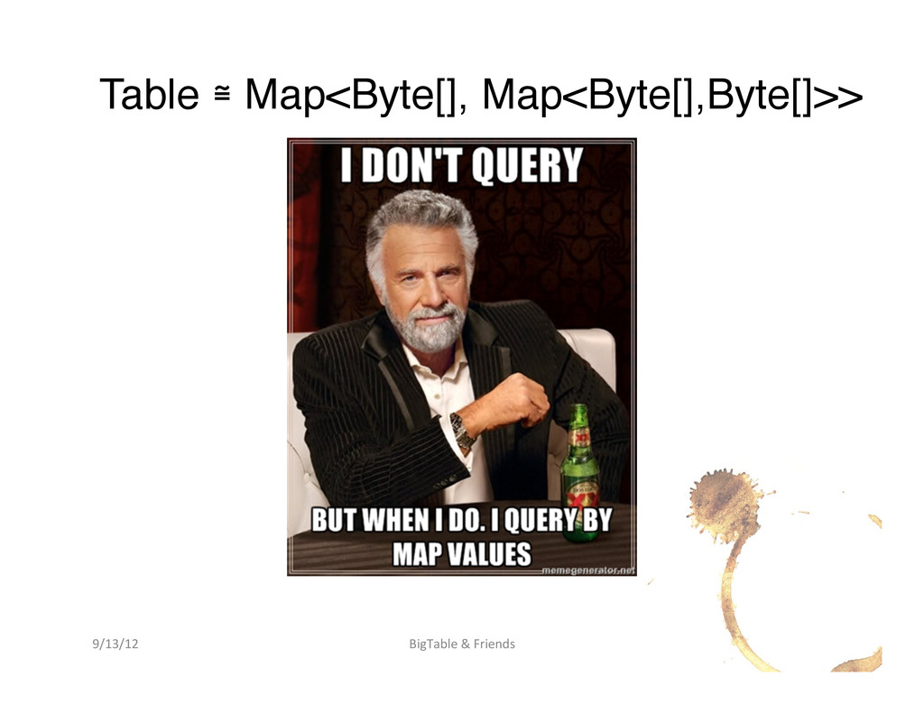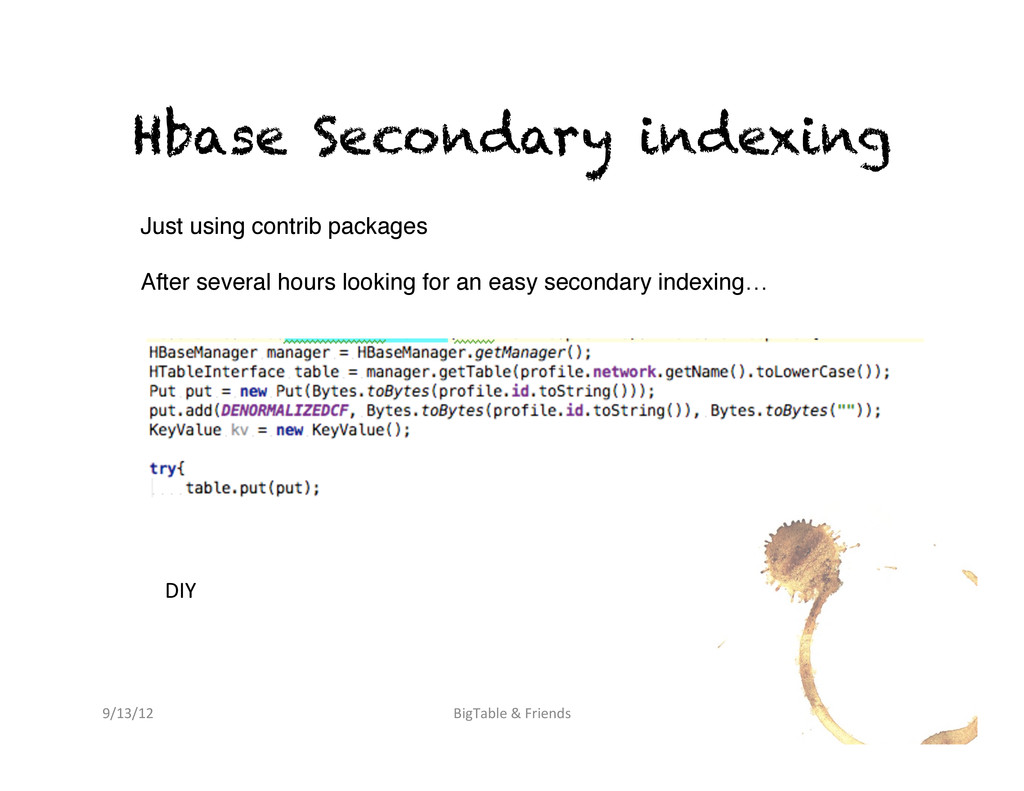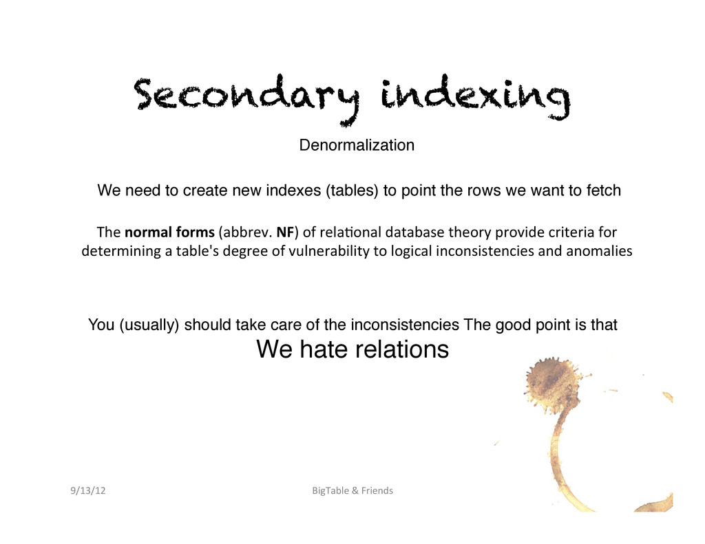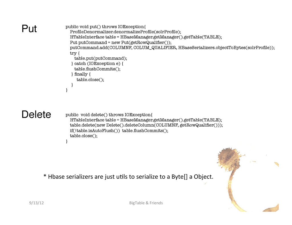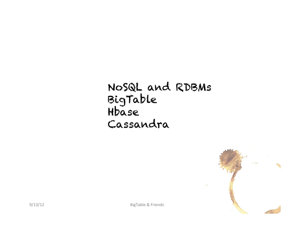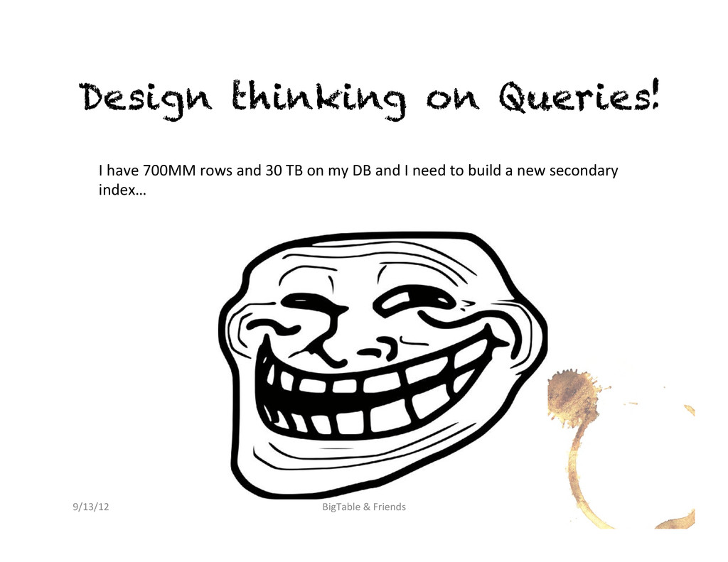 key_validation_class=TimeUUIDType and column_metadata=[{column_name: forge, validation_class: UTF8Type}, {column_name: revision, validation_class:UTF8Type, index_type:KEYS}, {column_name: repoRevision, validation_class:UTF8Type, index_type:KEYS}, {column_name: message, validation_class:UTF8Type}, {column_name: addedFiles, validation_class:UTF8Type}, {column_name: deletedFiles, validation_class:UTF8Type}, {column_name: modifiedFiles, validation_class:UTF8Type}, {column_name: replacedFiles, validation_class:UTF8Type}, {column_name: renamedFiles, validation_class:UTF8Type}, {column_name: repository, validation_class:LongType, index_type:KEYS}, {column_name: user, validation_class:LongType}, {column_name: date, validation_class:LongType}]; create column family project_contributions_stats_scf with column_type='Super'; create column family randoomStuff; 9/13/12 BigTable & Friends