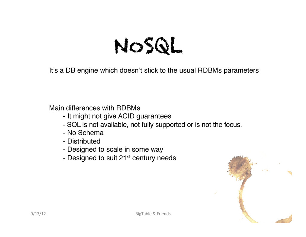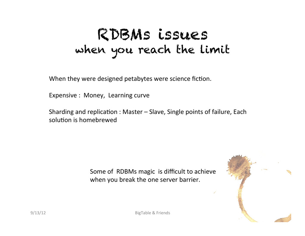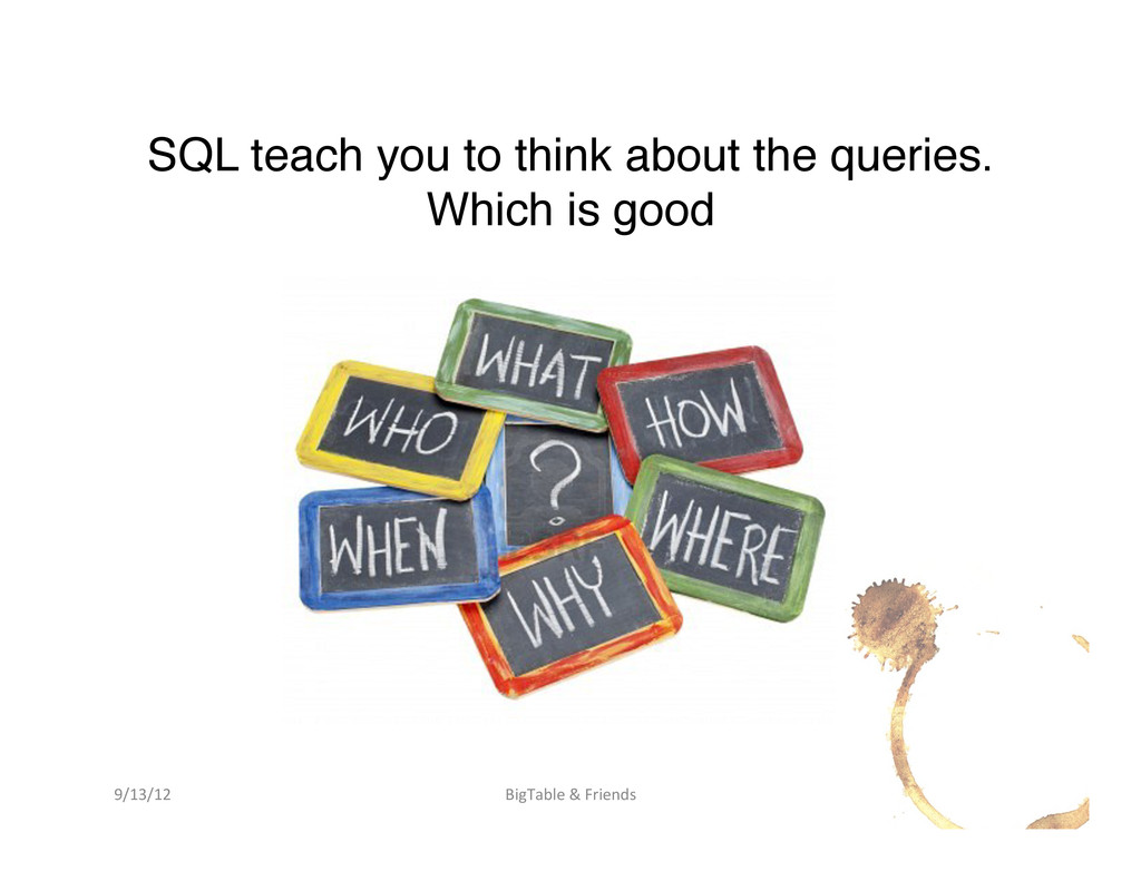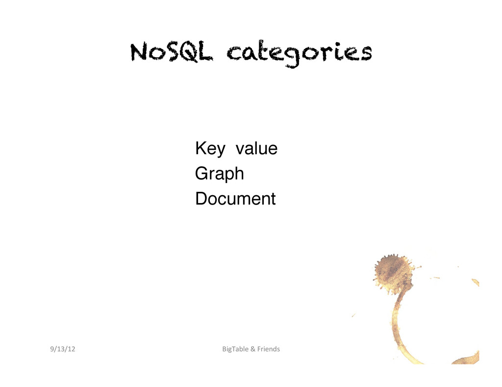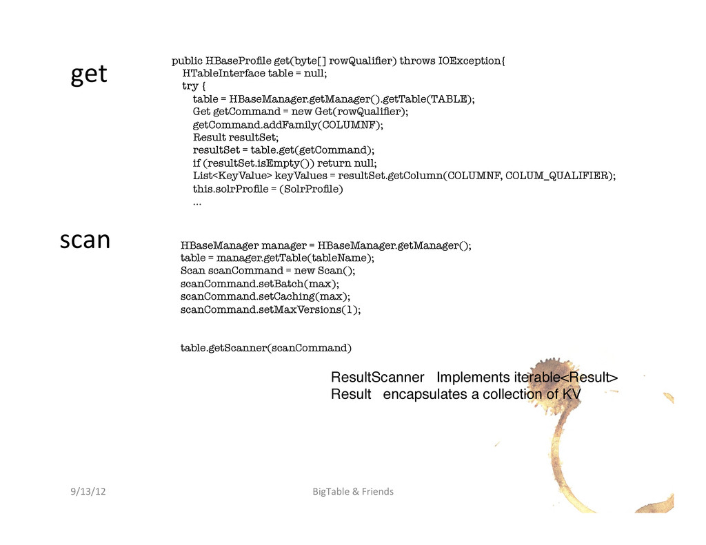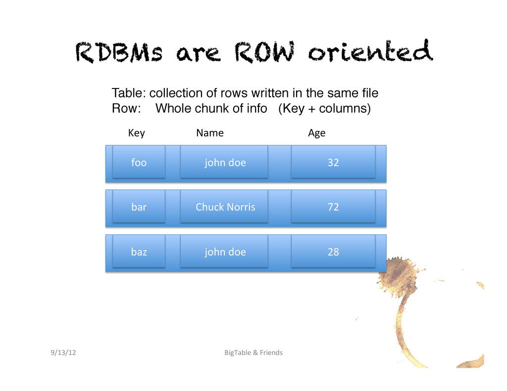 key_validation_class=TimeUUIDType and column_metadata=[{column_name: forge, validation_class: UTF8Type}, {column_name: revision, validation_class:UTF8Type, index_type:KEYS}, {column_name: repoRevision, validation_class:UTF8Type, index_type:KEYS}, {column_name: message, validation_class:UTF8Type}, {column_name: addedFiles, validation_class:UTF8Type}, {column_name: deletedFiles, validation_class:UTF8Type}, {column_name: modifiedFiles, validation_class:UTF8Type}, {column_name: replacedFiles, validation_class:UTF8Type}, {column_name: renamedFiles, validation_class:UTF8Type}, {column_name: repository, validation_class:LongType, index_type:KEYS}, {column_name: user, validation_class:LongType}, {column_name: date, validation_class:LongType}]; create column family project_contributions_stats_scf with column_type='Super'; create column family randoomStuff; 9/13/12 BigTable & Friends