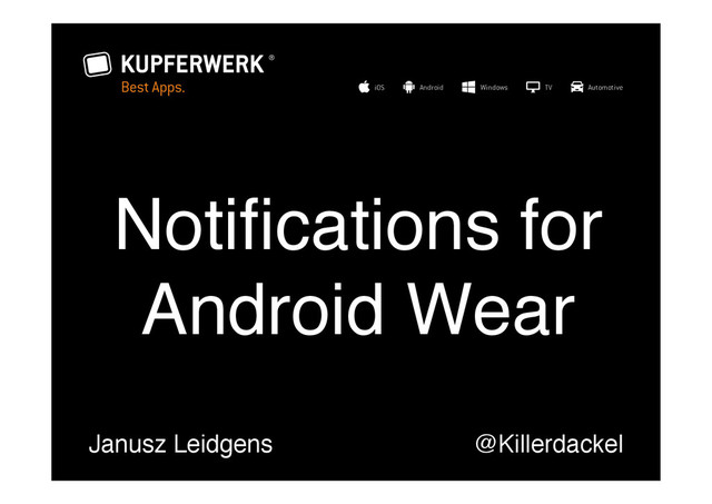 extender.setBackground(BitmapFactory.decodeResource( getResources(), R.drawable.notif_background)); extender.setContentIcon(R.drawable.ic_message); extender.setHintHideIcon(true); extender.extend(builder);! § Android Wear cards have 400 x 400 background that should be placed into the drawable-nodpi folder!