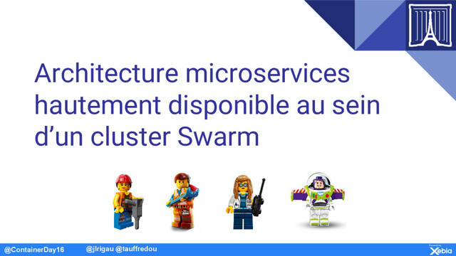 Les conteneurs épousent la philosophie des architectures microservices. Nous vous présenterons un socle technique résilient et scalable pour distribuer des microservices sur une infrastructure s’appuyant sur Docker Swarm pour l’orchestration des conteneurs et Interlock avec HAProxy pour la gestion du Service Discovery, le tout accessible depuis le Cloud. Nous déploierons au sein de cette infrastructure une application de trombinoscope développée en architecture microservices. Chaque individu présent au sein du trombinoscope sera représenté par un microservice spécifique, que nous pourrons déployer et faire scaler au sein du cluster. Avec autant de microservices, il est nécessaire de mesurer leur état, nous vous présenterons également les outils de supervision que nous avons mis en place au sein de la solution.