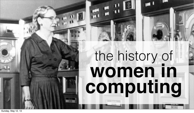 Computer programming was once seen as "women's work." Ada Lovelace, Grace Hopper, Adele Goldberg, and others played pivotal roles in paving the way for today's computing professions. So why then do we see so few women in our community? We'll cover the history of women in computing, possible causes of the gender imbalance, and ideas for how our community can shape a future that includes more women.