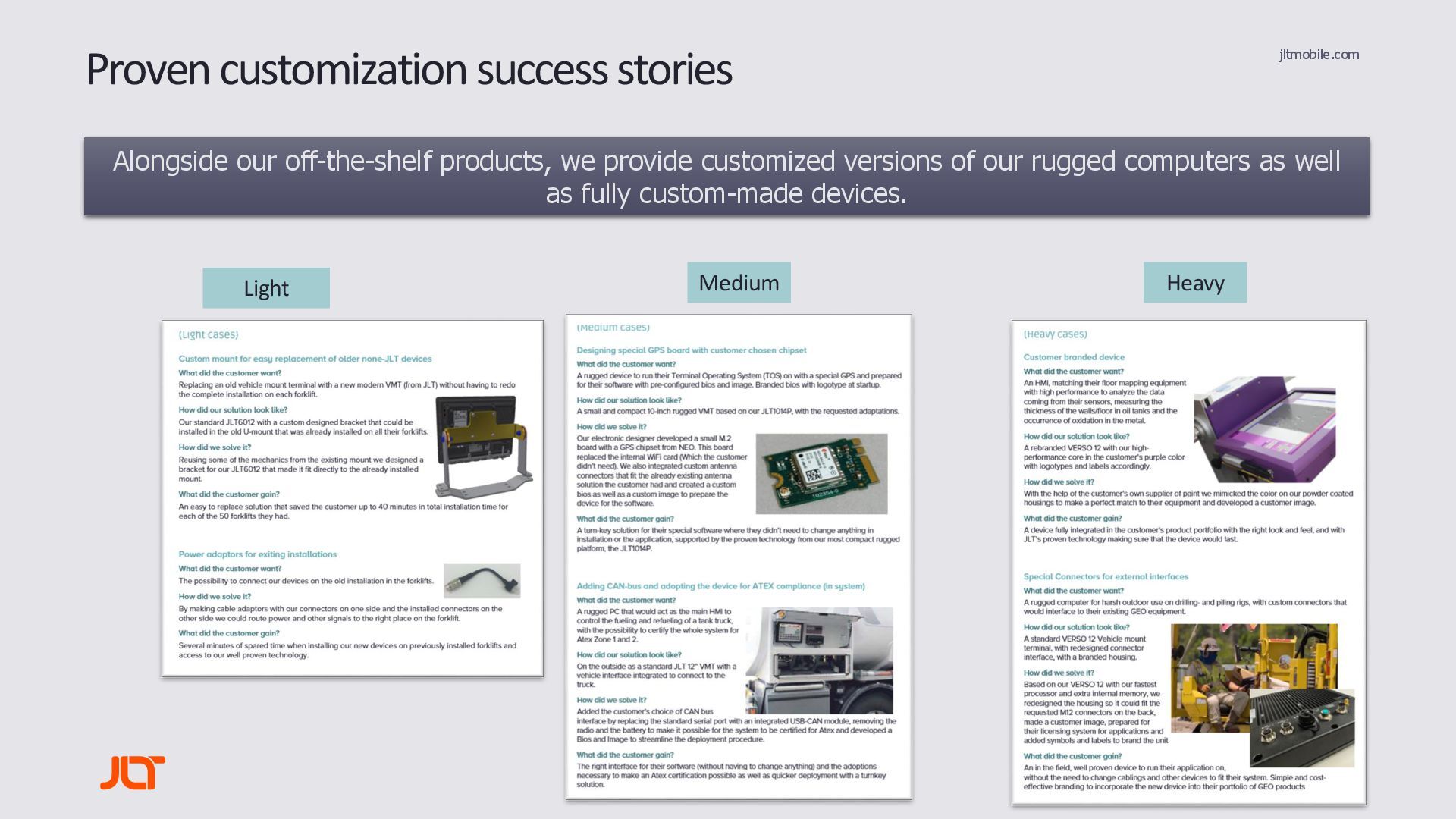 Need technology that works where others fail? JLT Mobile Computers delivers rugged computer systems that combine robust design with high-speed performance. These computers are built to withstand shock, water, and dirt while delivering mission-critical functionality. From warehouses to off-road fleets, JLT's systems empower your team with tools they can depend on. With flexible mounting options and long lifecycle support, JLT makes rugged computing seamless. Tough, tested, and tailored—experience why professionals trust JLT in every extreme.