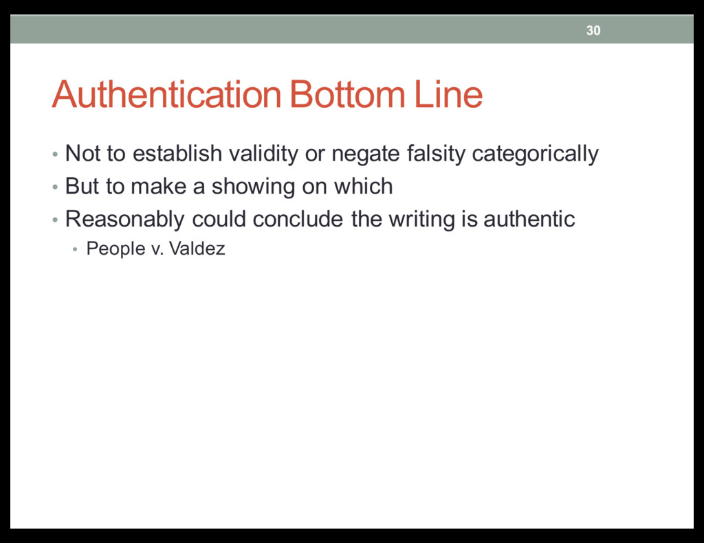 photo is identifiable • “Pervasive consistency of content” • Numerous personal photographs • Communications to and from the subject • Other details tending to show identity and ownership • Lack of motive on the part of others to adulterate content • Timing of the posting • People v. Valdez 26