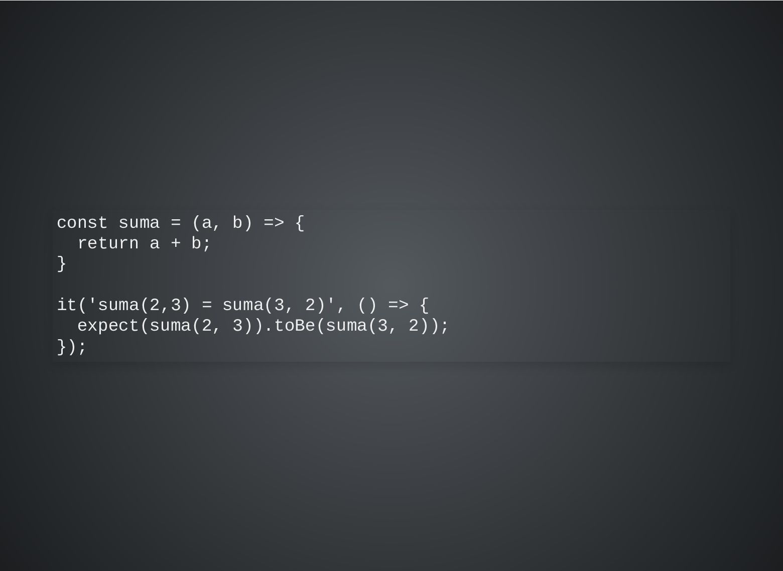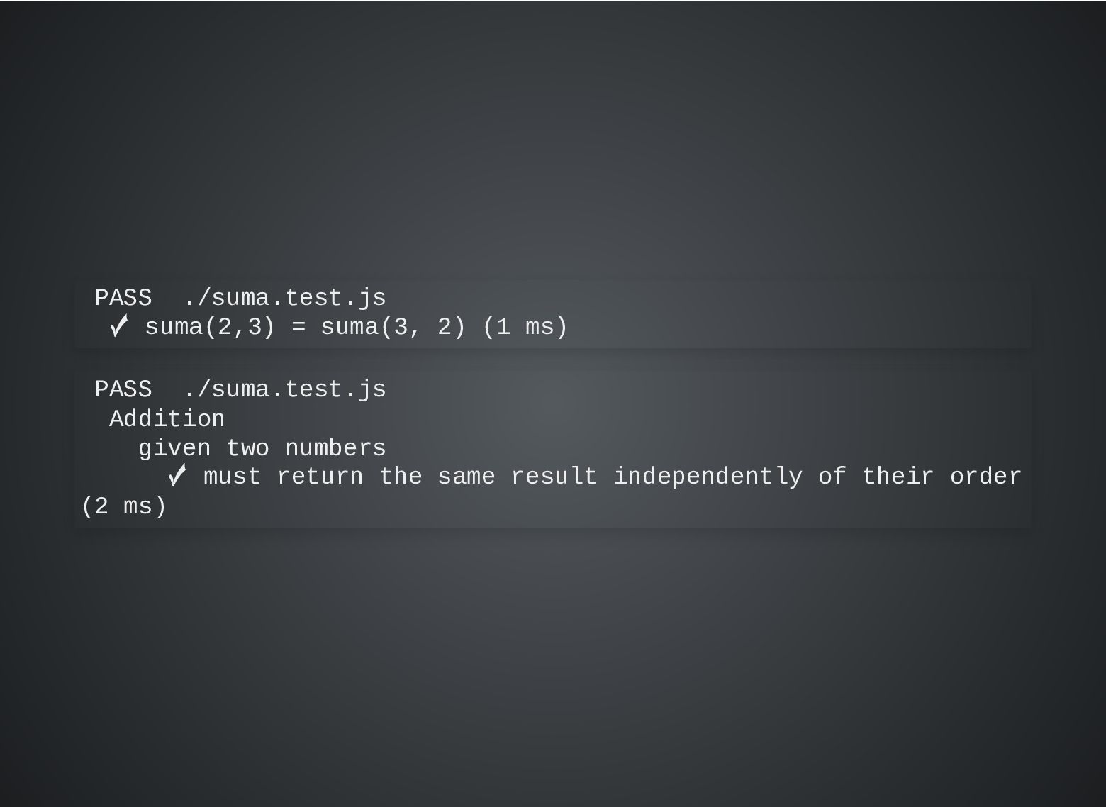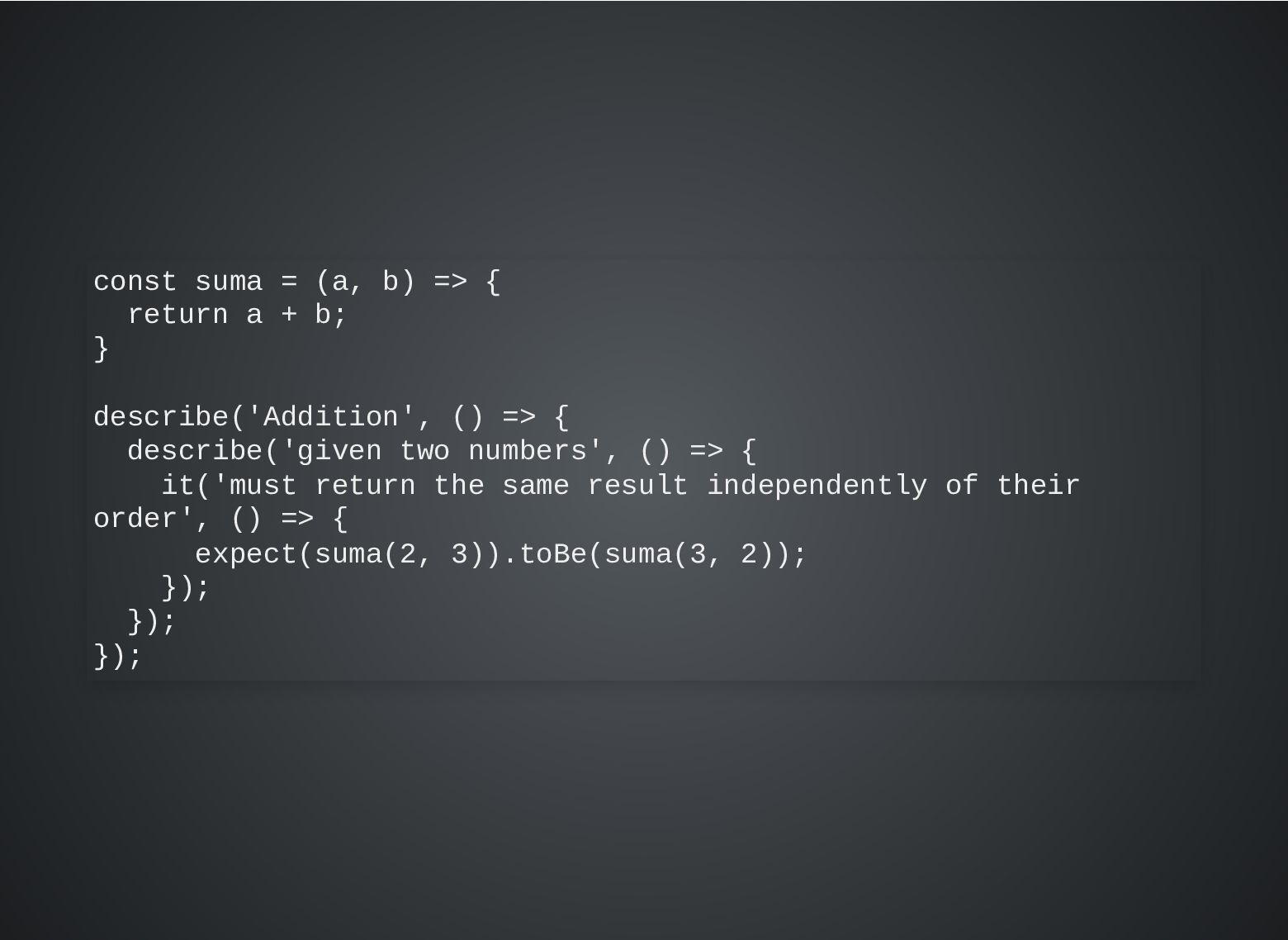 b; } describe('Addition', () => { describe('given two numbers', () => { it('must return the same result independently of their order', () => { expect(suma(2, 3)).toBe(suma(3, 2)); }); }); });