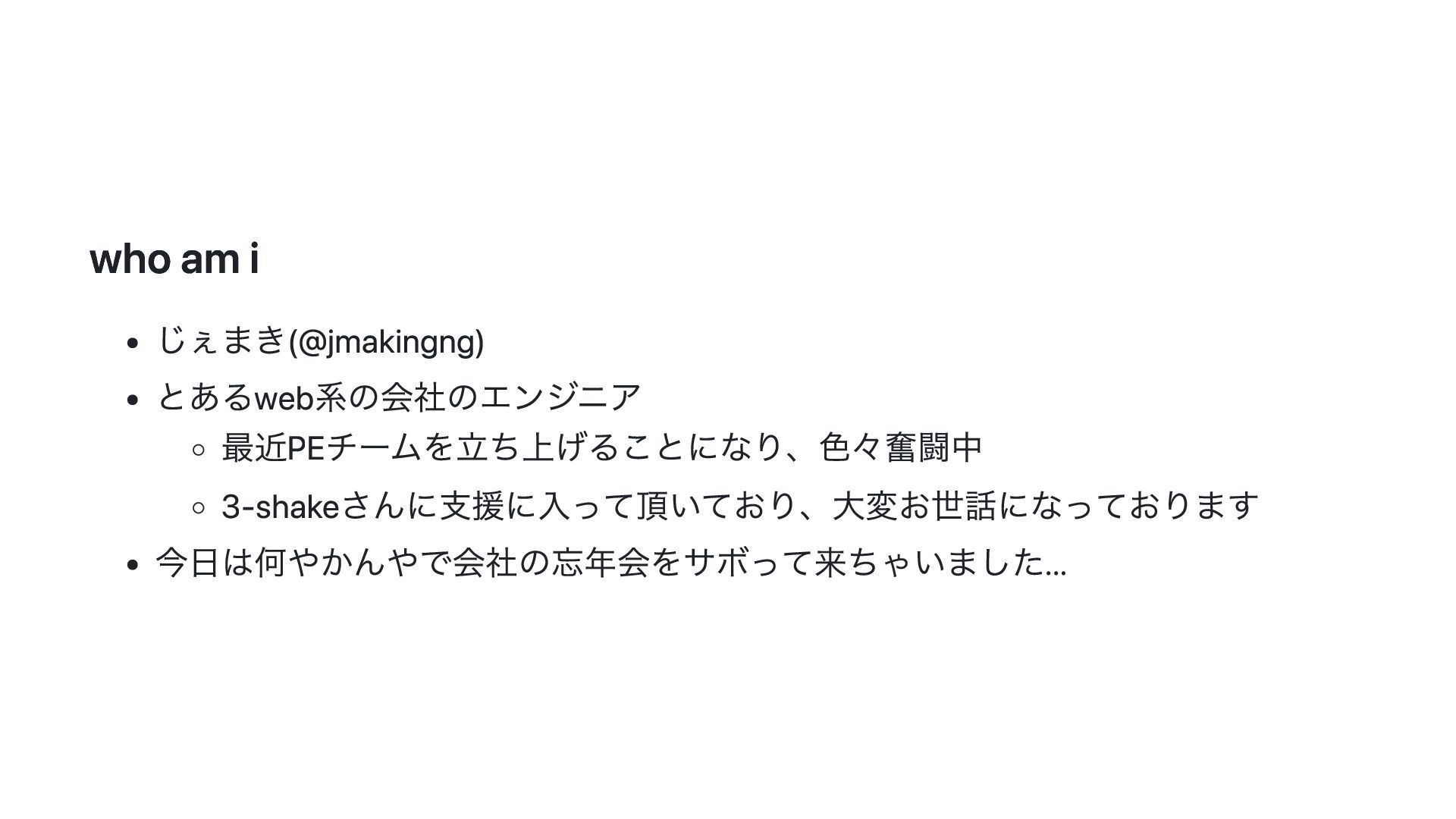 who am i じぇまき(@jmakingng) とあるweb系の会社のエンジニア 最近PEチームを立ち上げることになり、色々奮闘中 3-shakeさんに支援に入って頂いており、大変お世話になっております 今日は何やかんやで会社の忘年会をサボって来ちゃいました...