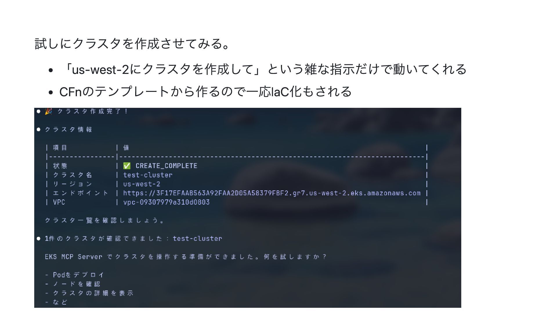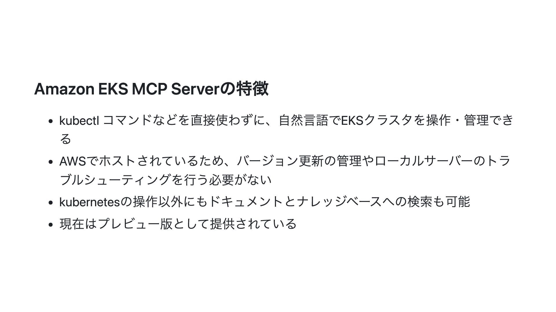 Amazon EKS MCP Serverの特徴 kubectl コマンドなどを直接使わずに、自然言語でEKSクラスタを操作・管理でき る AWSでホストされているため、バージョン更新の管理やローカルサーバーのトラ ブルシューティングを行う必要がない kubernetesの操作以外にもドキュメントとナレッジベースへの検索も可能