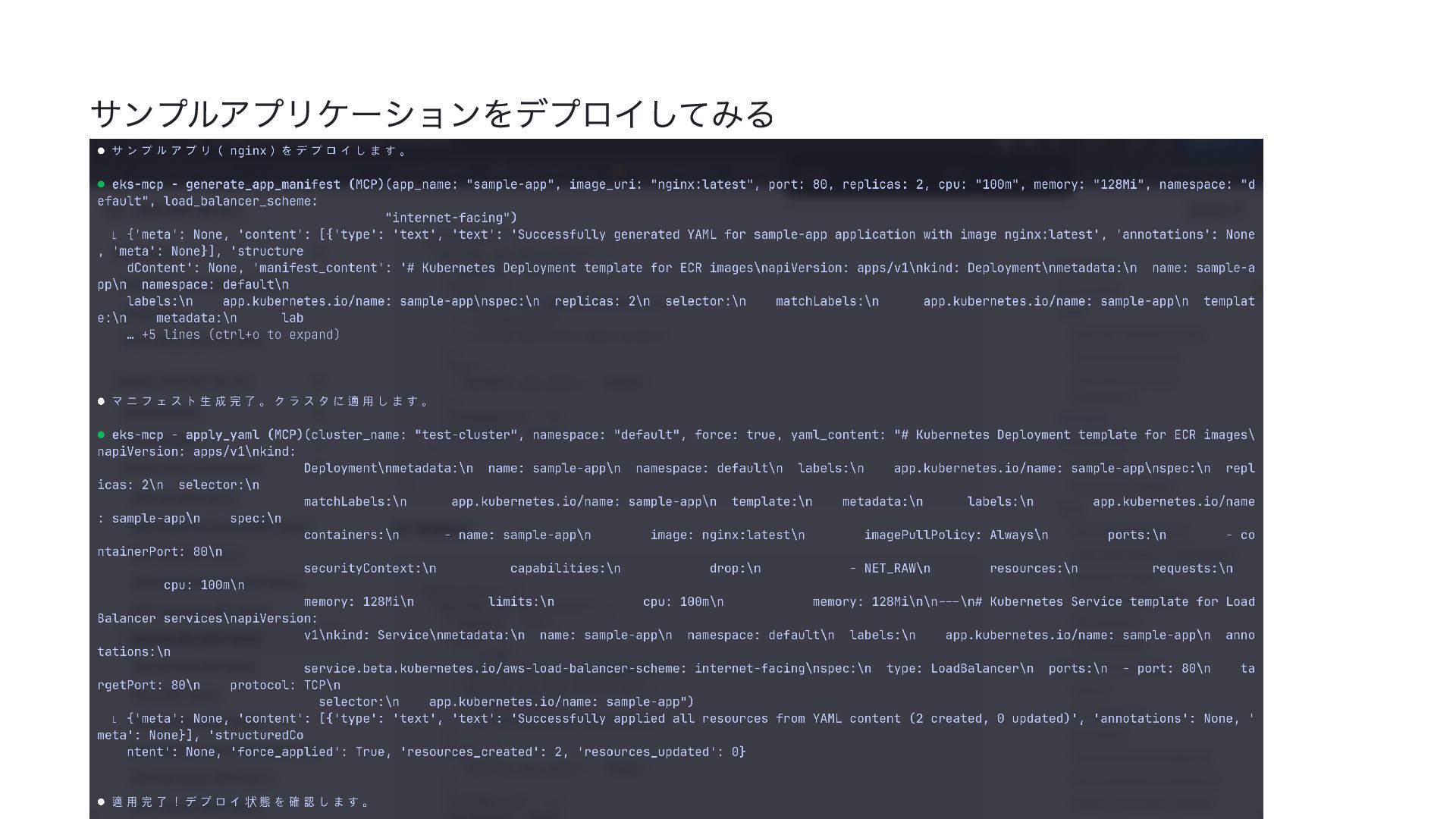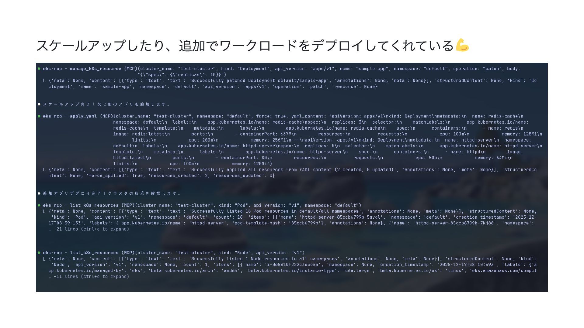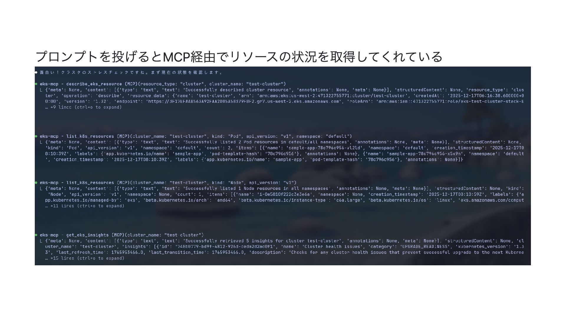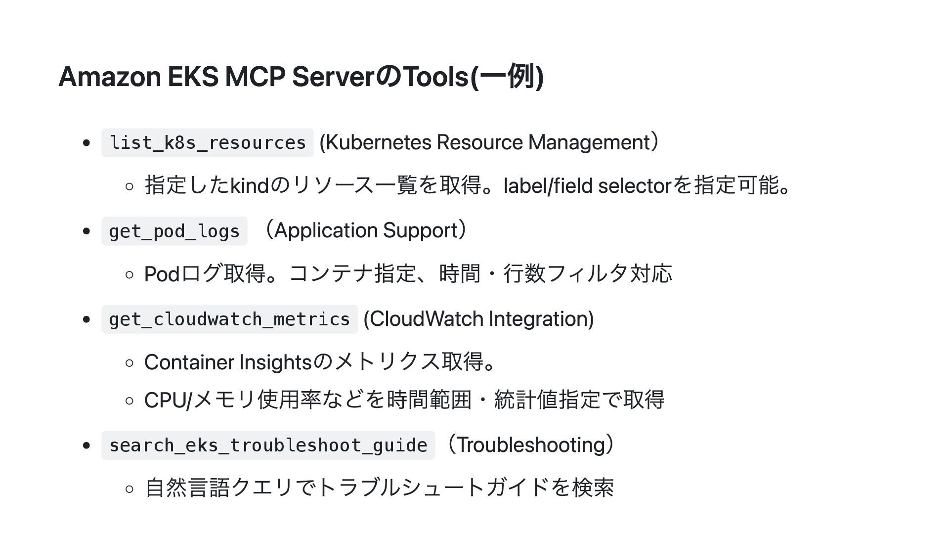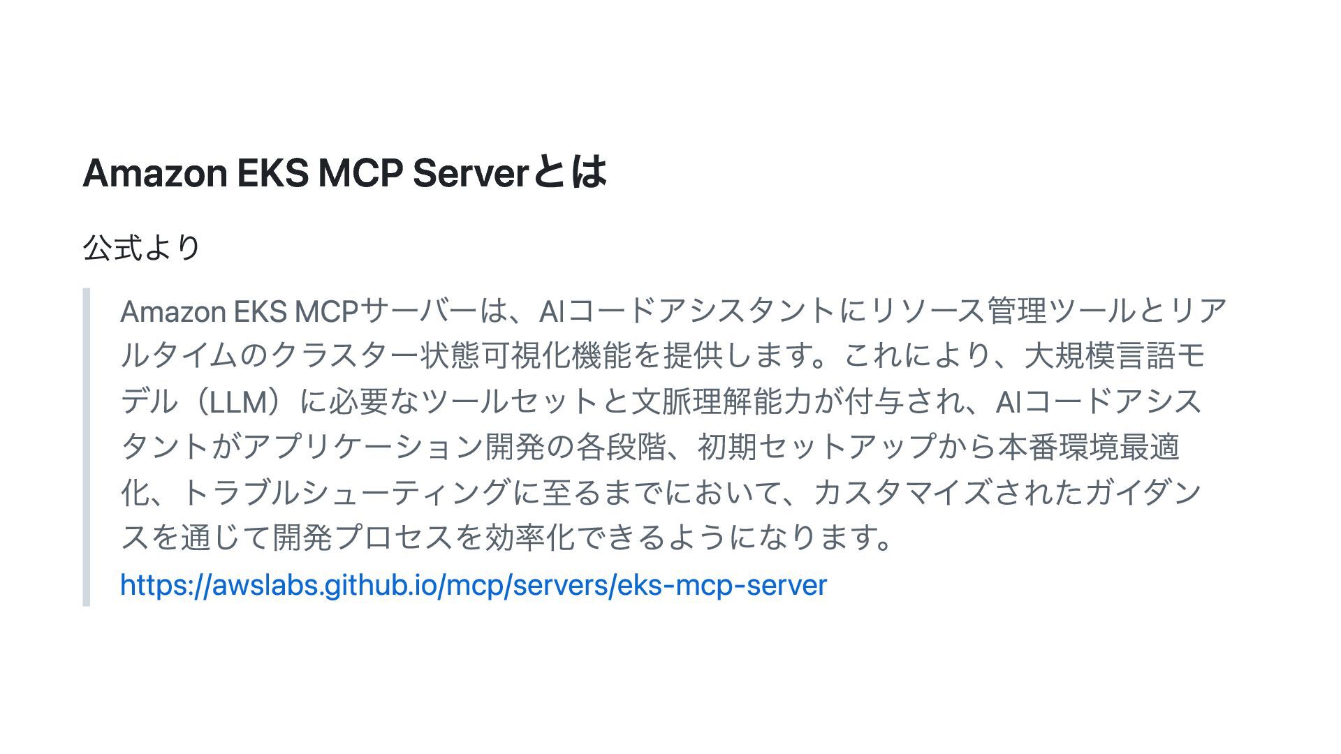 Amazon EKS MCP Serverとは 公式より Amazon EKS MCPサーバーは、AIコードアシスタントにリソース管理ツールとリア ルタイムのクラスター状態可視化機能を提供します。これにより、大規模言語モ デル(LLM)に必要なツールセットと文脈理解能力が付与され、AIコードアシス