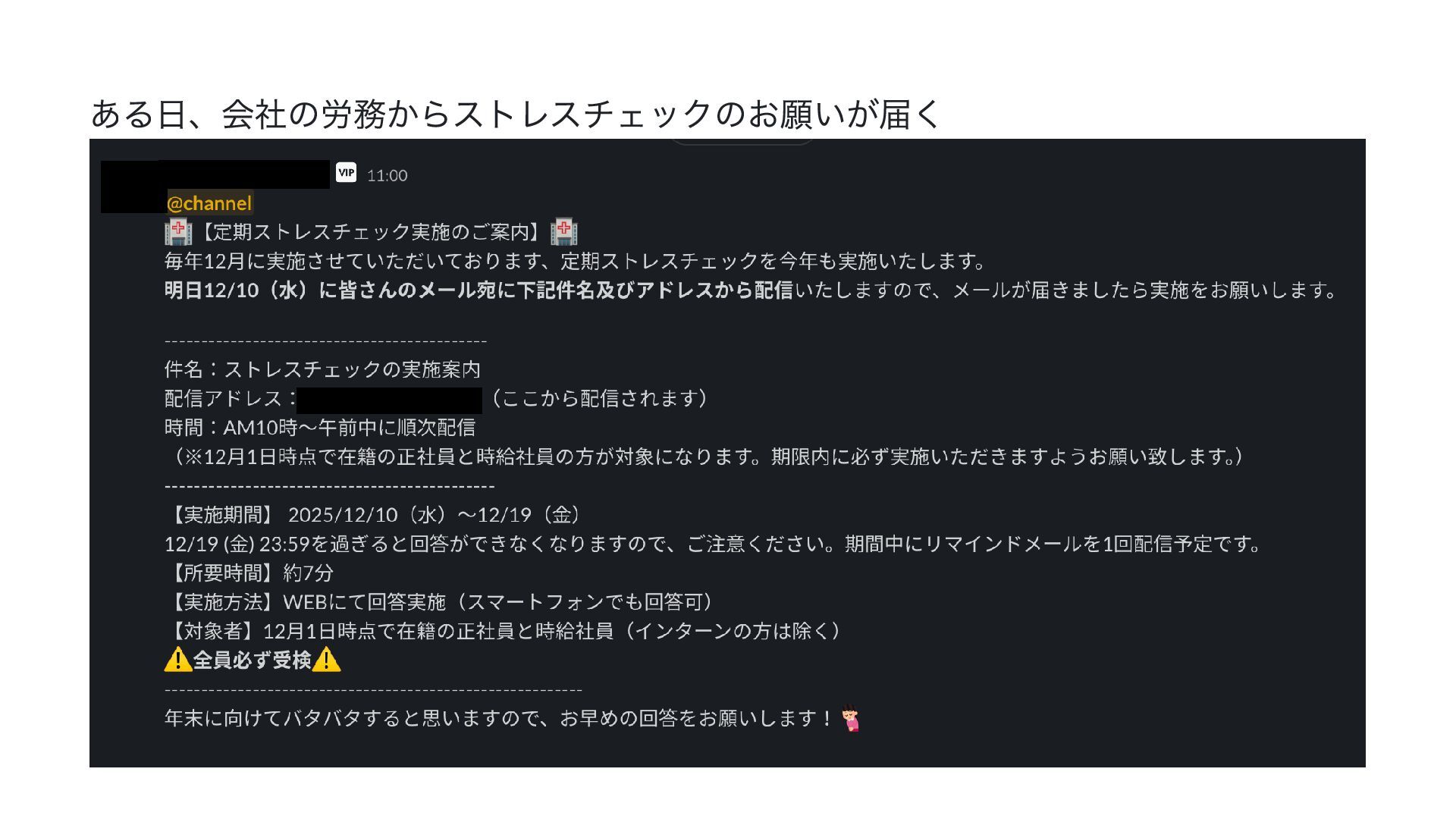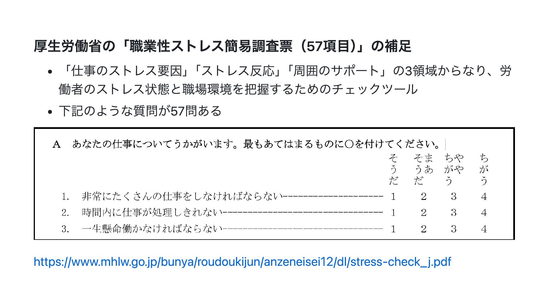 厚生労働省の「職業性ストレス簡易調査票(57項目) 」の補足 「仕事のストレス要因」 「ストレス反応」 「周囲のサポート」の3領域からなり、労 働者のストレス状態と職場環境を把握するためのチェックツール 下記のような質問が57問ある https://www.mhlw.go.jp/bunya/roudoukijun/anzeneisei12/dl/stress-check_j.pdf