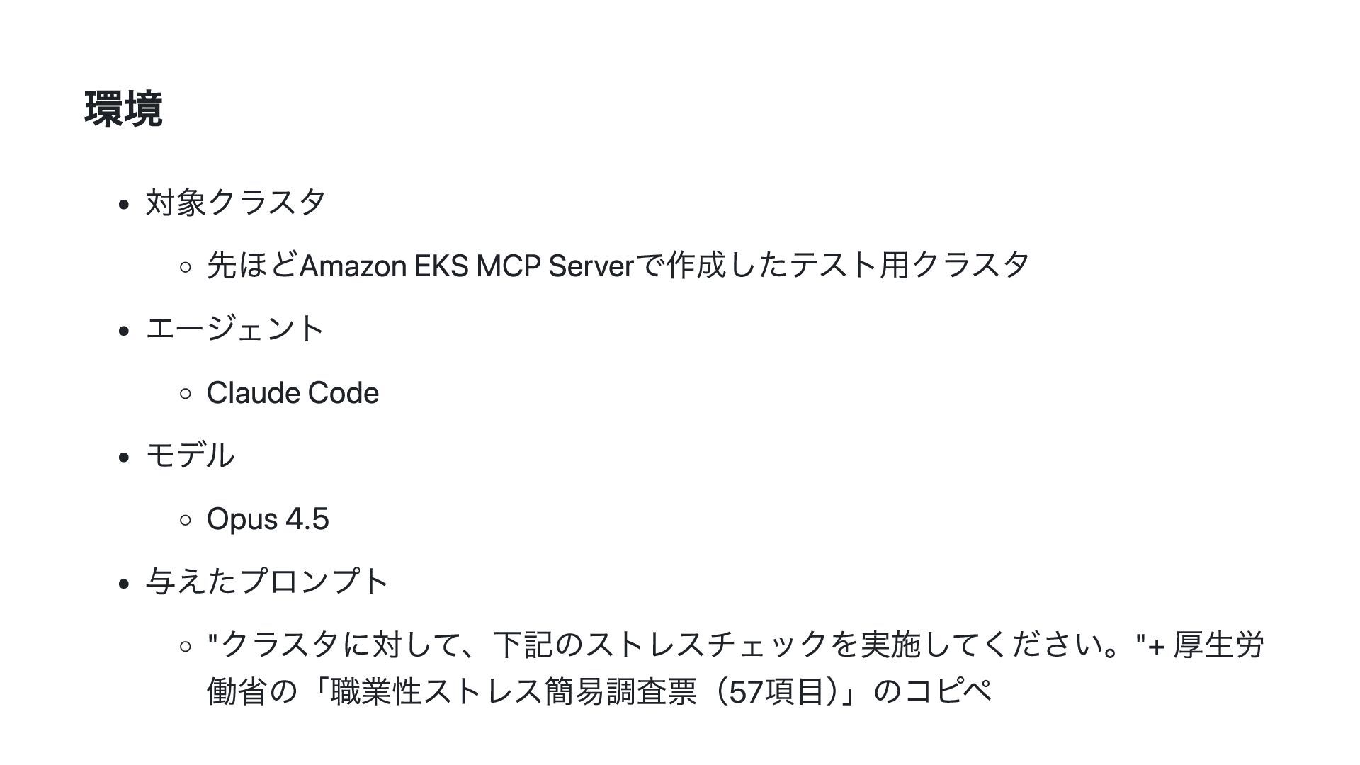 環境 対象クラスタ 先ほどAmazon EKS MCP Serverで作成したテスト用クラスタ エージェント Claude Code モデル