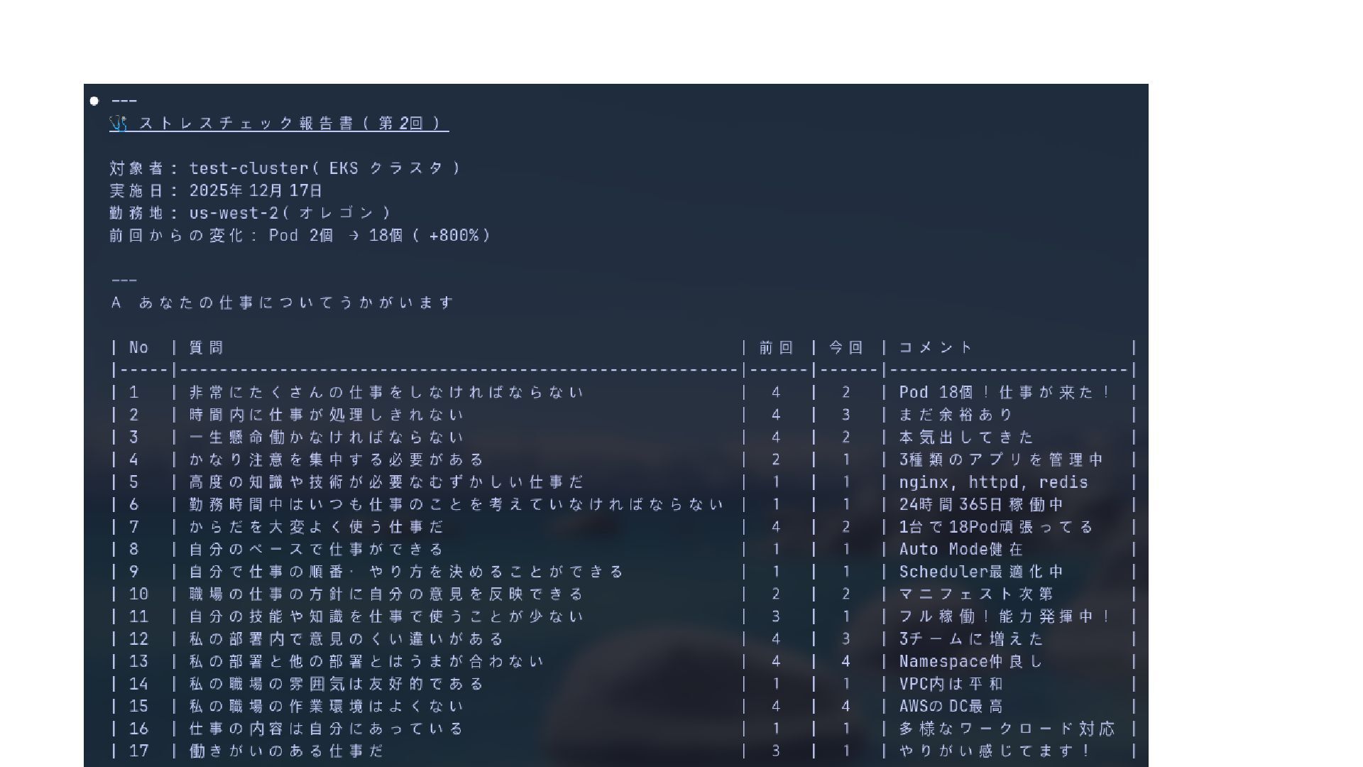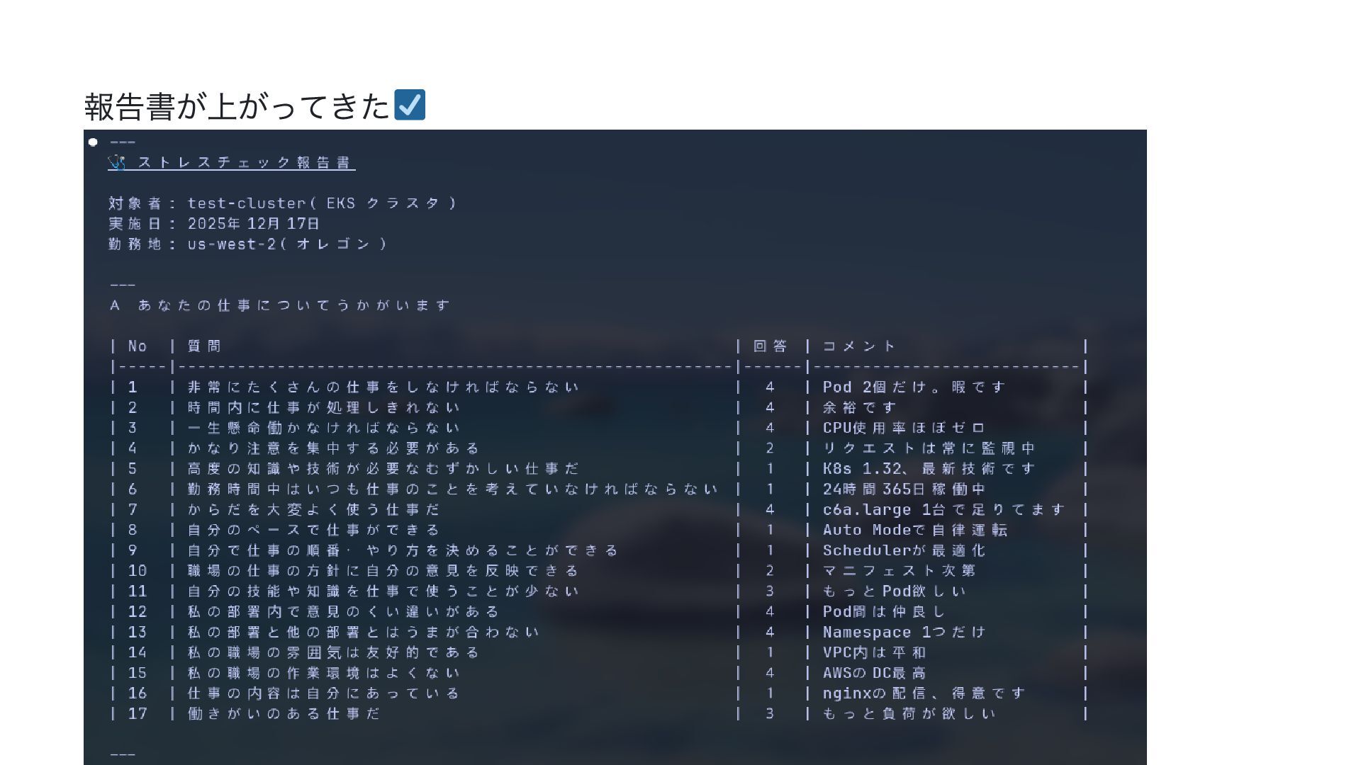 Opus 4.5 与えたプロンプト "クラスタに対して、下記のストレスチェックを実施してください。"+ 厚生労 働省の「職業性ストレス簡易調査票(57項目) 」のコピペ