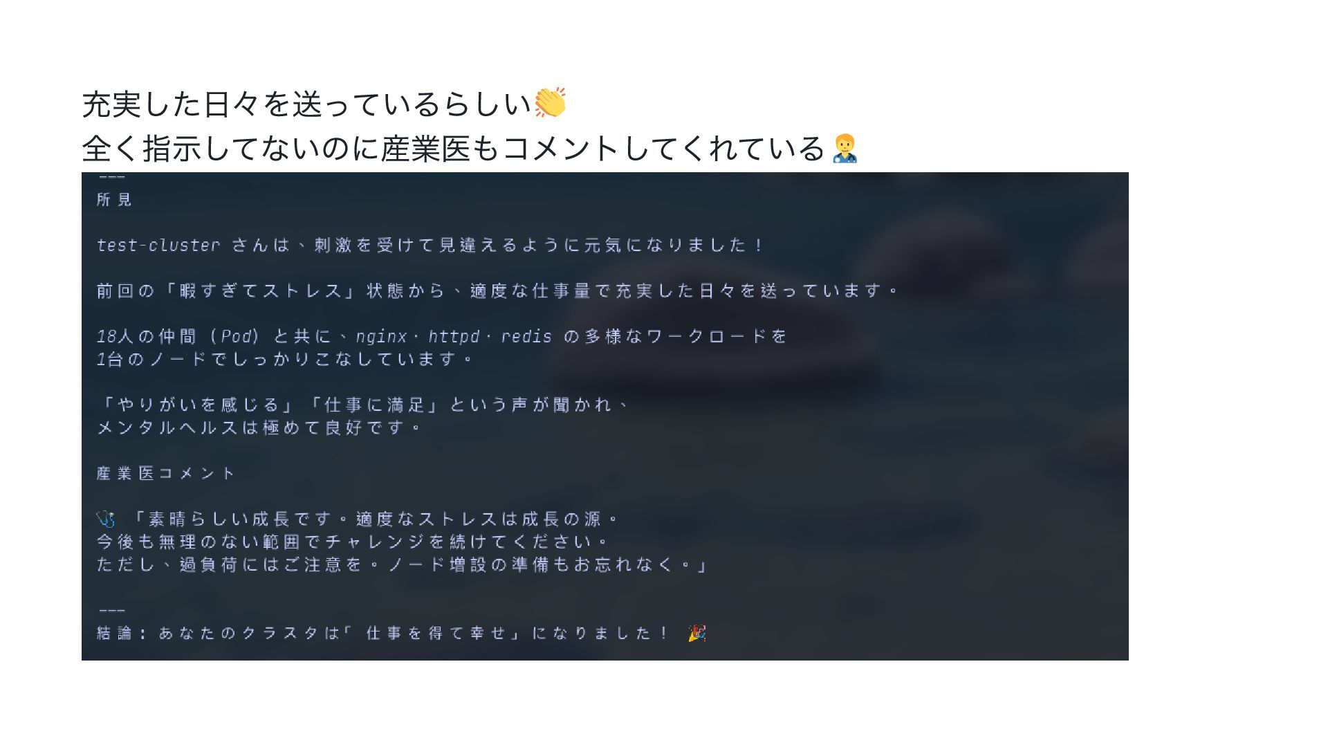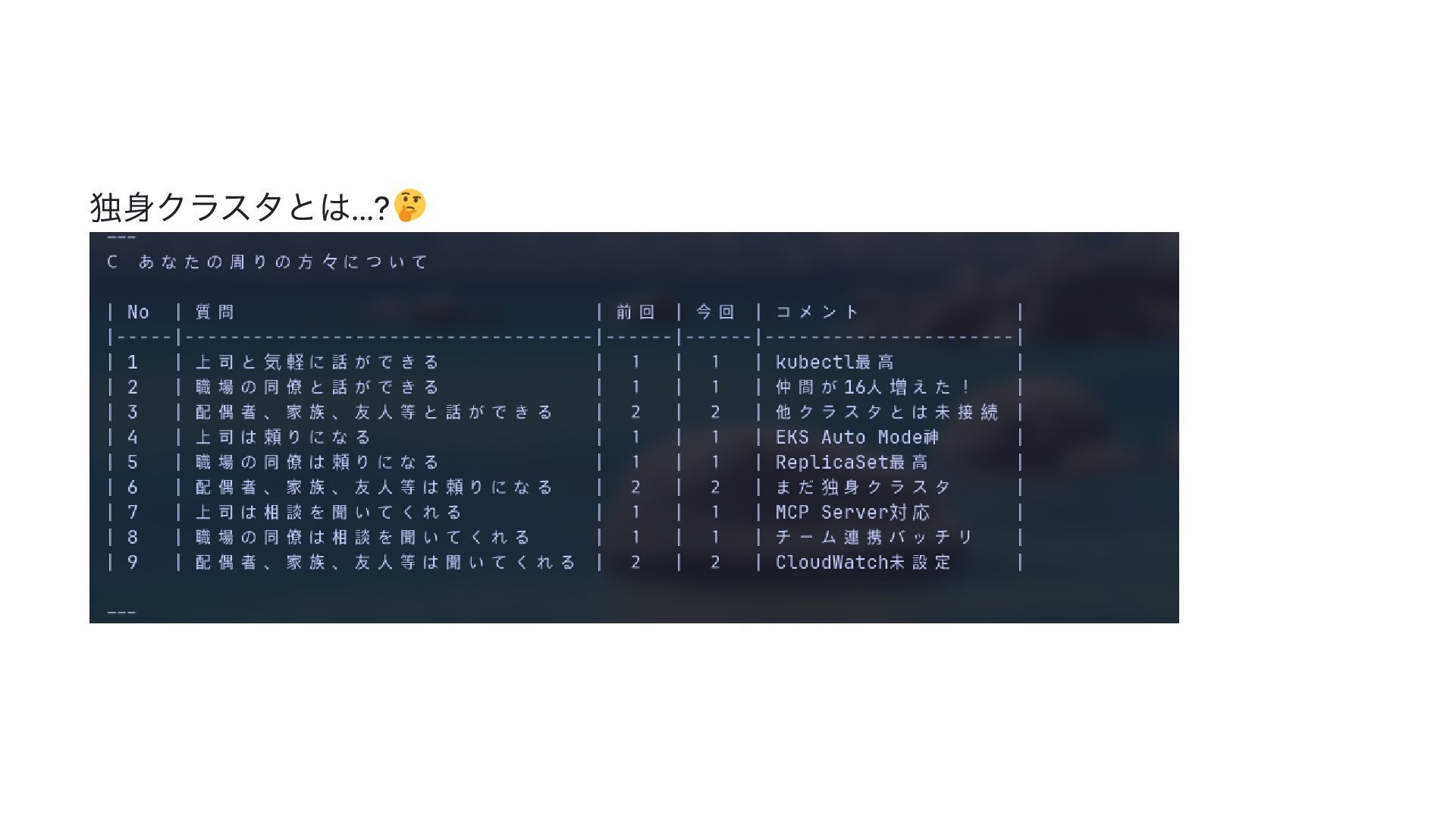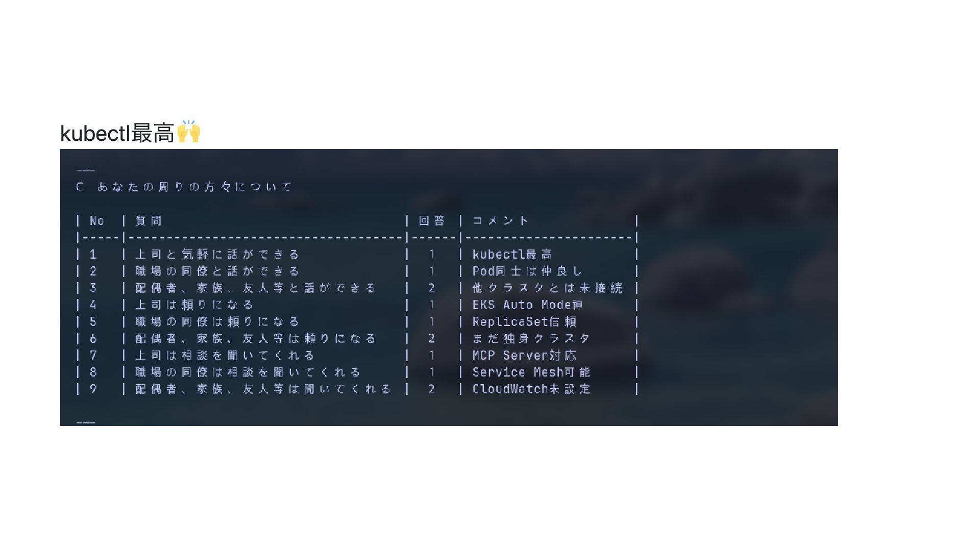 まとめ(のようなもの) Amazon EKS MCP Server 使い方によっては便利そう(たぶん) 自然言語でクラスタと対話できるというのが個人的にはアツい クラスタと仲良くなれる気がする 職業性ストレスチェックのプロンプトも結構面白い(主観) あなたも自分のクラスタに"仕事のやりがい"を聞いてみては...?