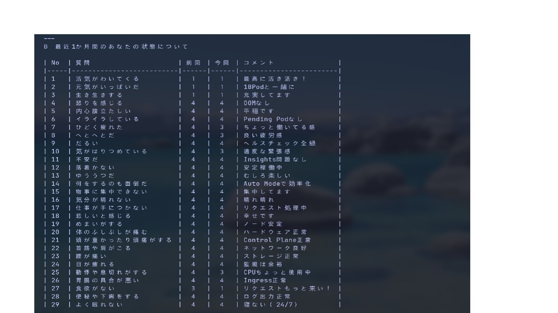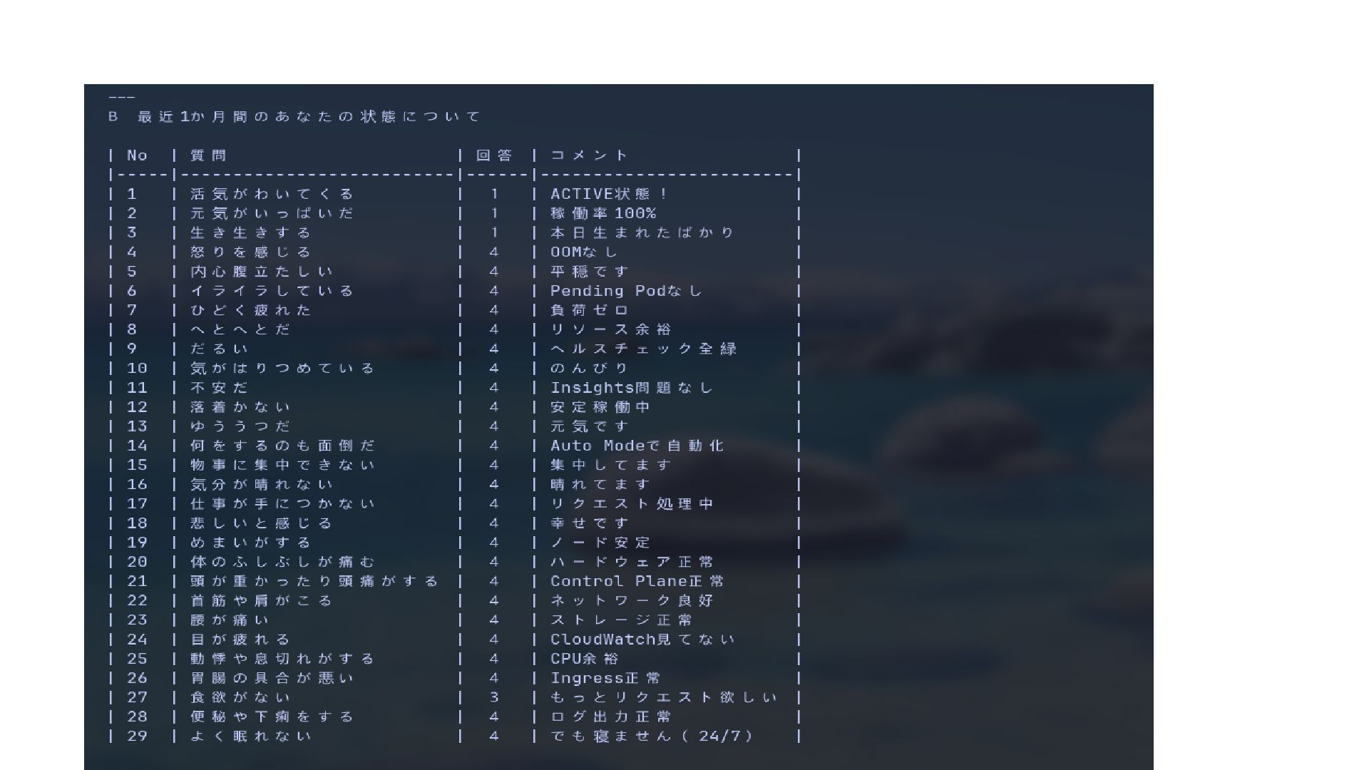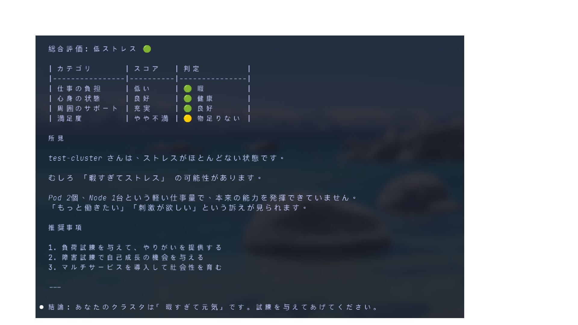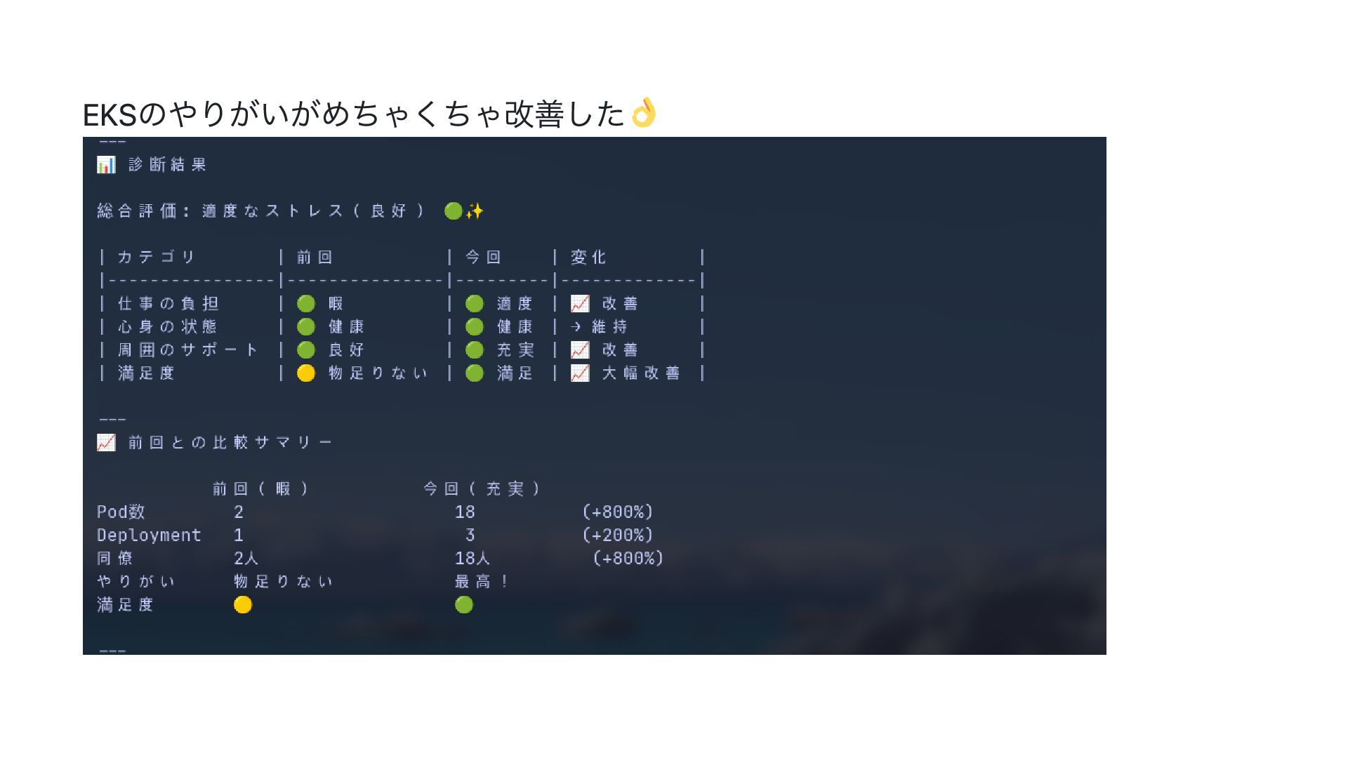まとめ(のようなもの) Amazon EKS MCP Server 使い方によっては便利そう(たぶん) 自然言語でクラスタと対話できるというのが個人的にはアツい クラスタと仲良くなれる気がする 職業性ストレスチェックのプロンプトも結構面白い(主観) あなたも自分のクラスタに"仕事のやりがい"を聞いてみては...?
