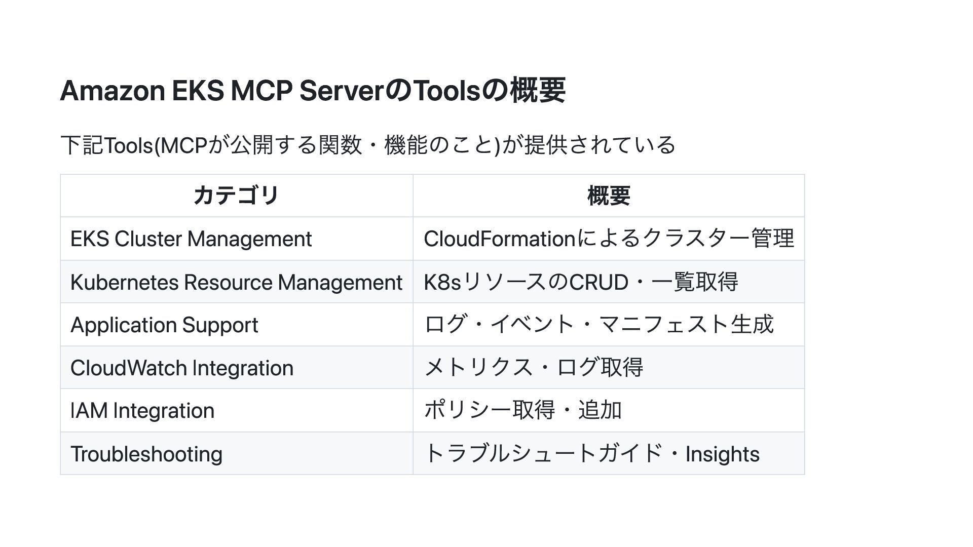 Amazon EKS MCP ServerのToolsの概要 下記Tools(MCPが公開する関数・機能のこと)が提供されている カテゴリ 概要 EKS Cluster Management