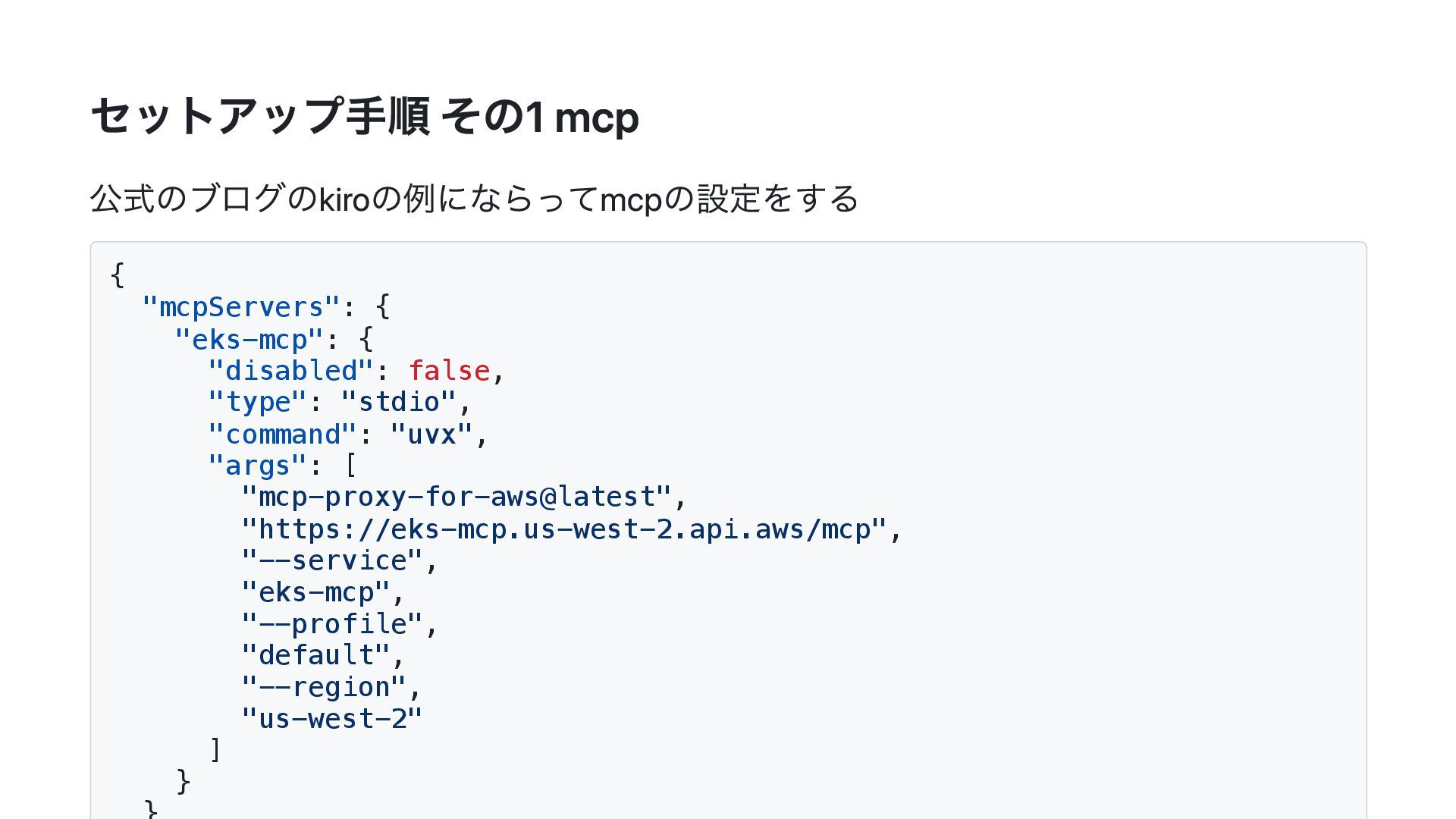 セットアップ手順 その1 mcp 公式のブログのkiroの例にならってmcpの設定をする { "mcpServers": { "eks-mcp": { "disabled":
