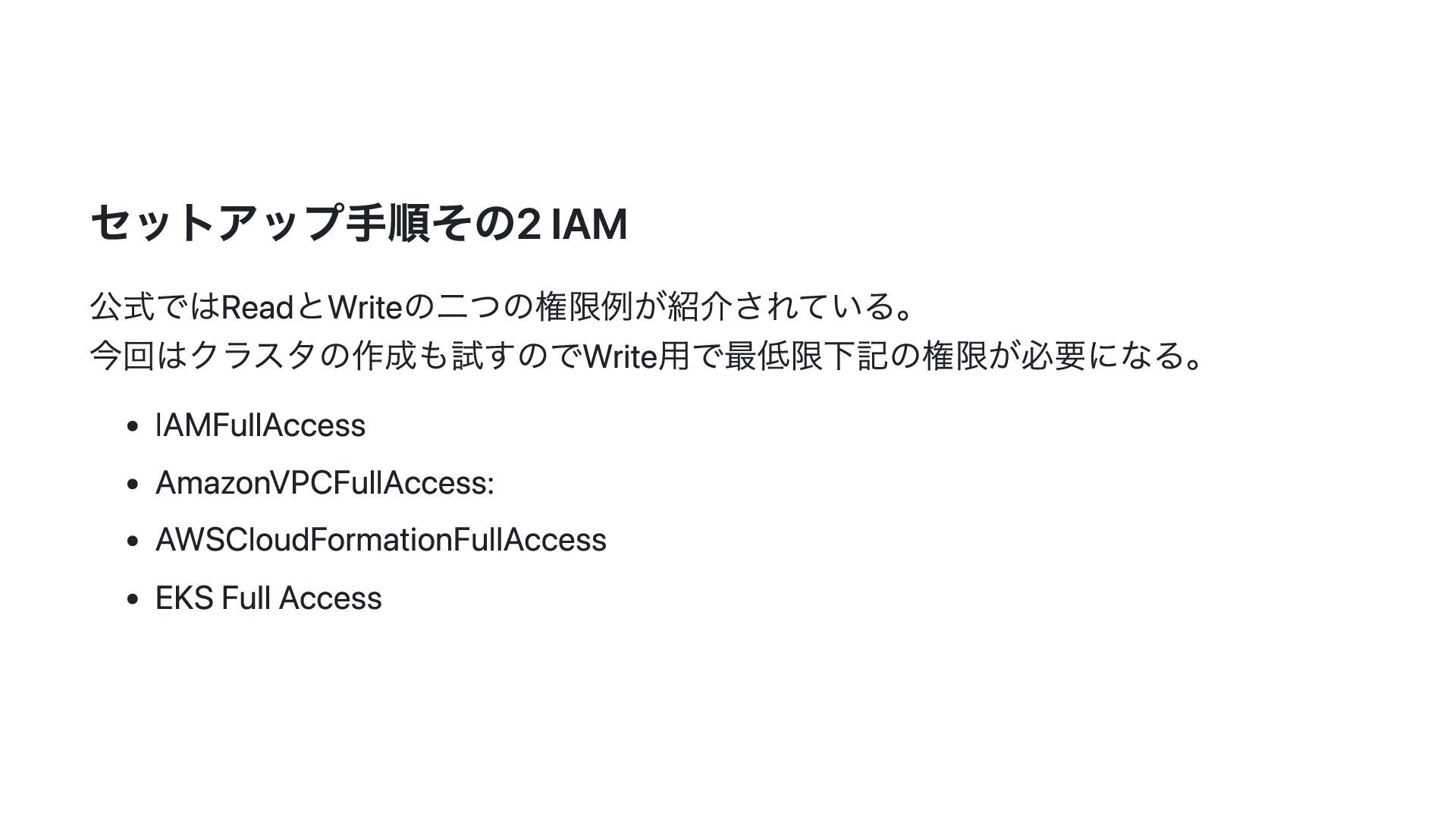 セットアップ手順その2 IAM 公式ではReadとWriteの二つの権限例が紹介されている。 今回はクラスタの作成も試すのでWrite用で最低限下記の権限が必要になる。 IAMFullAccess AmazonVPCFullAccess: AWSCloudFormationFullAccess EKS Full Access