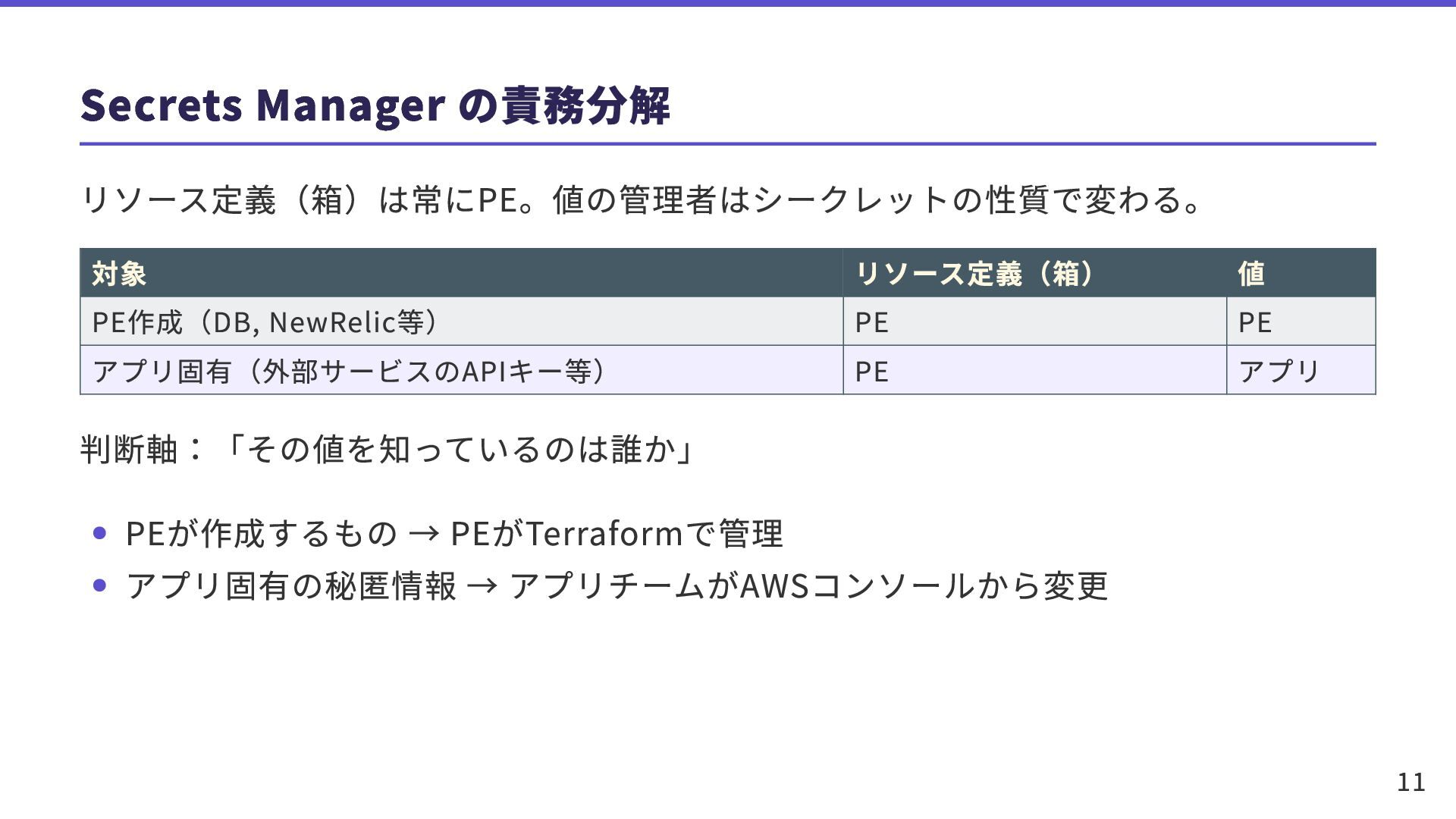 PE アプリ固有(外部サービスのAPIキー等) PE アプリ 判断軸:「その値を知っているのは誰か」 PEが作成するもの → PEがTerraformで管理 アプリ固有の秘匿情報 → アプリチームがAWSコンソールから変更 11