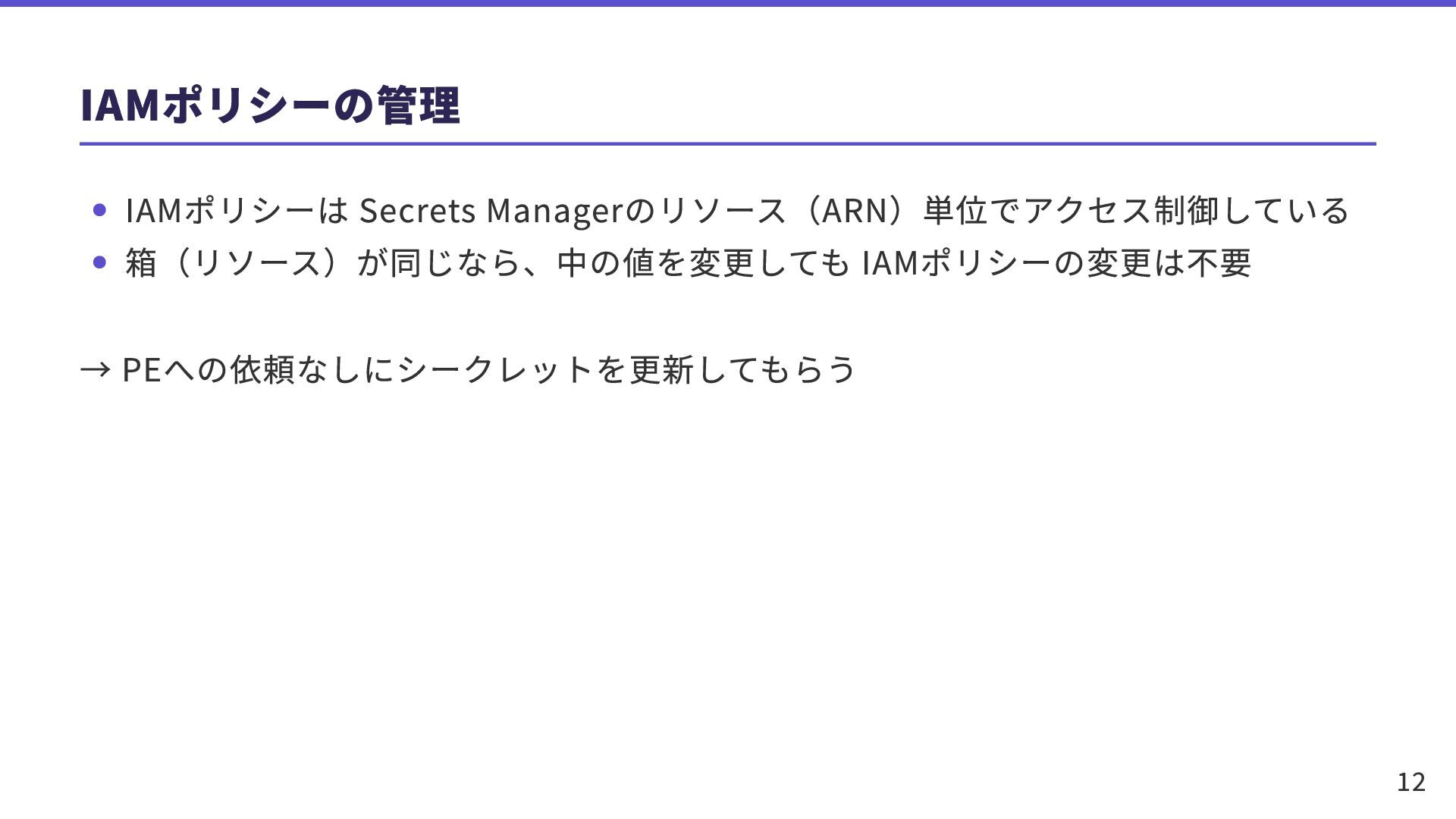 IAMポリシーの管理 IAMポリシーは Secrets Managerのリソース(ARN)単位でアクセス制御している 箱(リソース)が同じなら、中の値を変更しても IAMポリシーの変更は不要 → PEへの依頼なしにシークレットを更新してもらう 12
