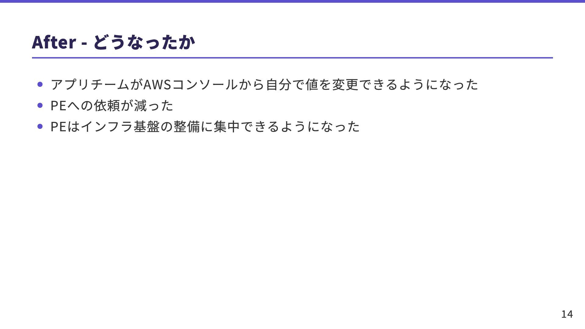 After - どうなったか アプリチームがAWSコンソールから自分で値を変更できるようになった PEへの依頼が減った PEはインフラ基盤の整備に集中できるようになった 14