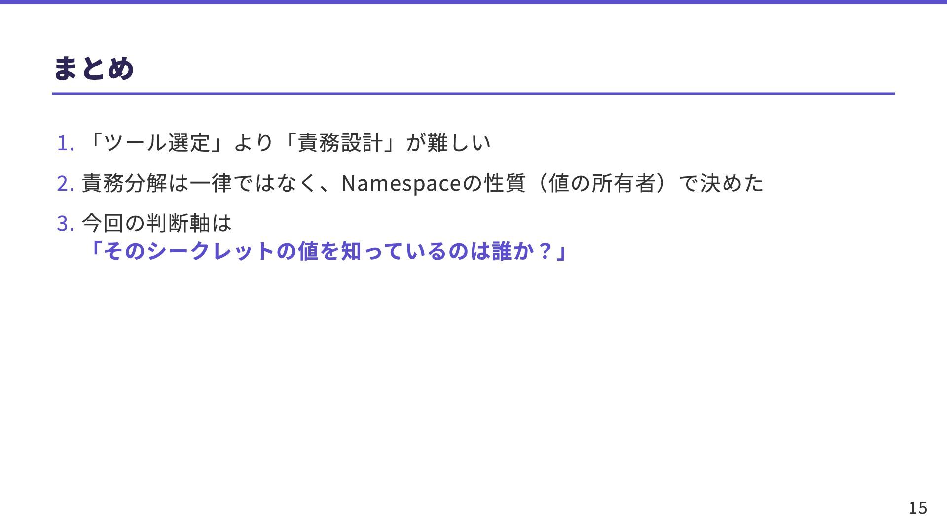 まとめ 1. 「ツール選定」より「責務設計」が難しい 2. 責務分解は一律ではなく、Namespaceの性質(値の所有者)で決めた 3. 今回の判断軸は 「そのシークレットの値を知っているのは誰か?」 15