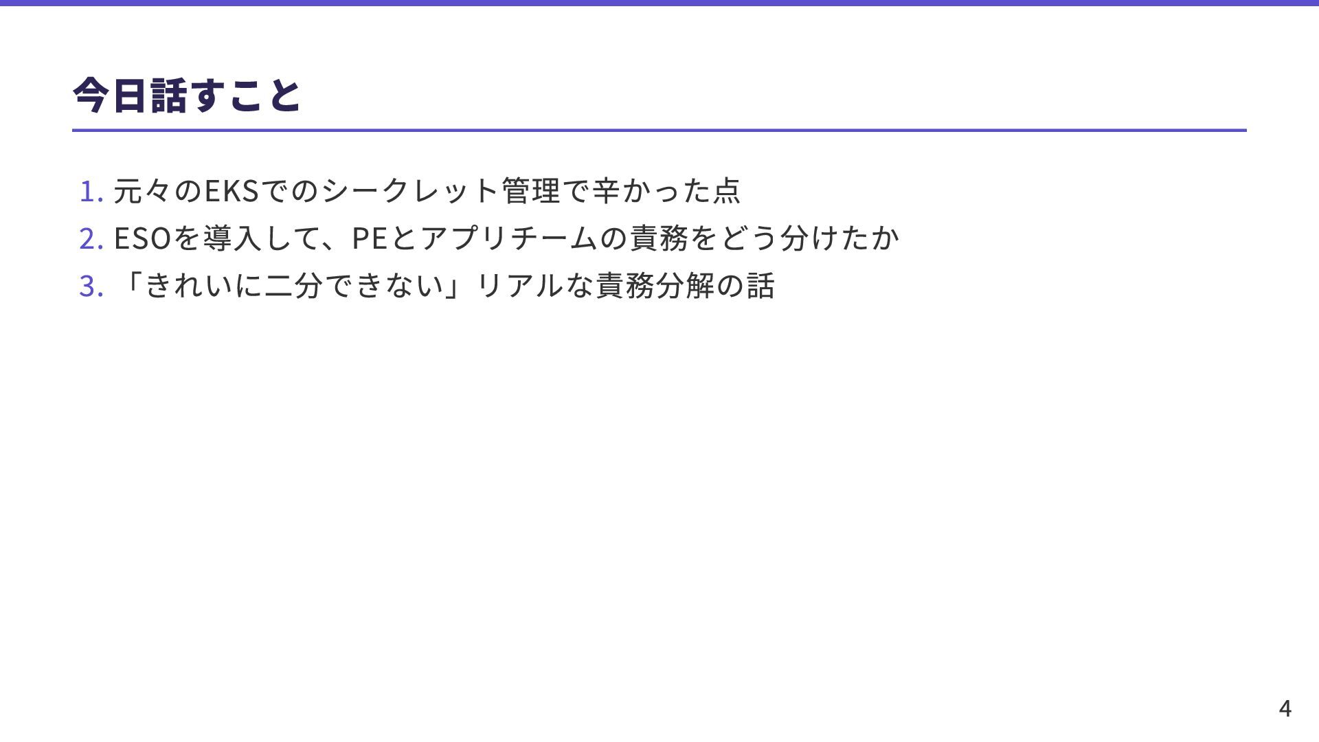 今日話すこと 1. 元々のEKSでのシークレット管理で辛かった点 2. ESOを導入して、PEとアプリチームの責務をどう分けたか 3. 「きれいに二分できない」リアルな責務分解の話 4