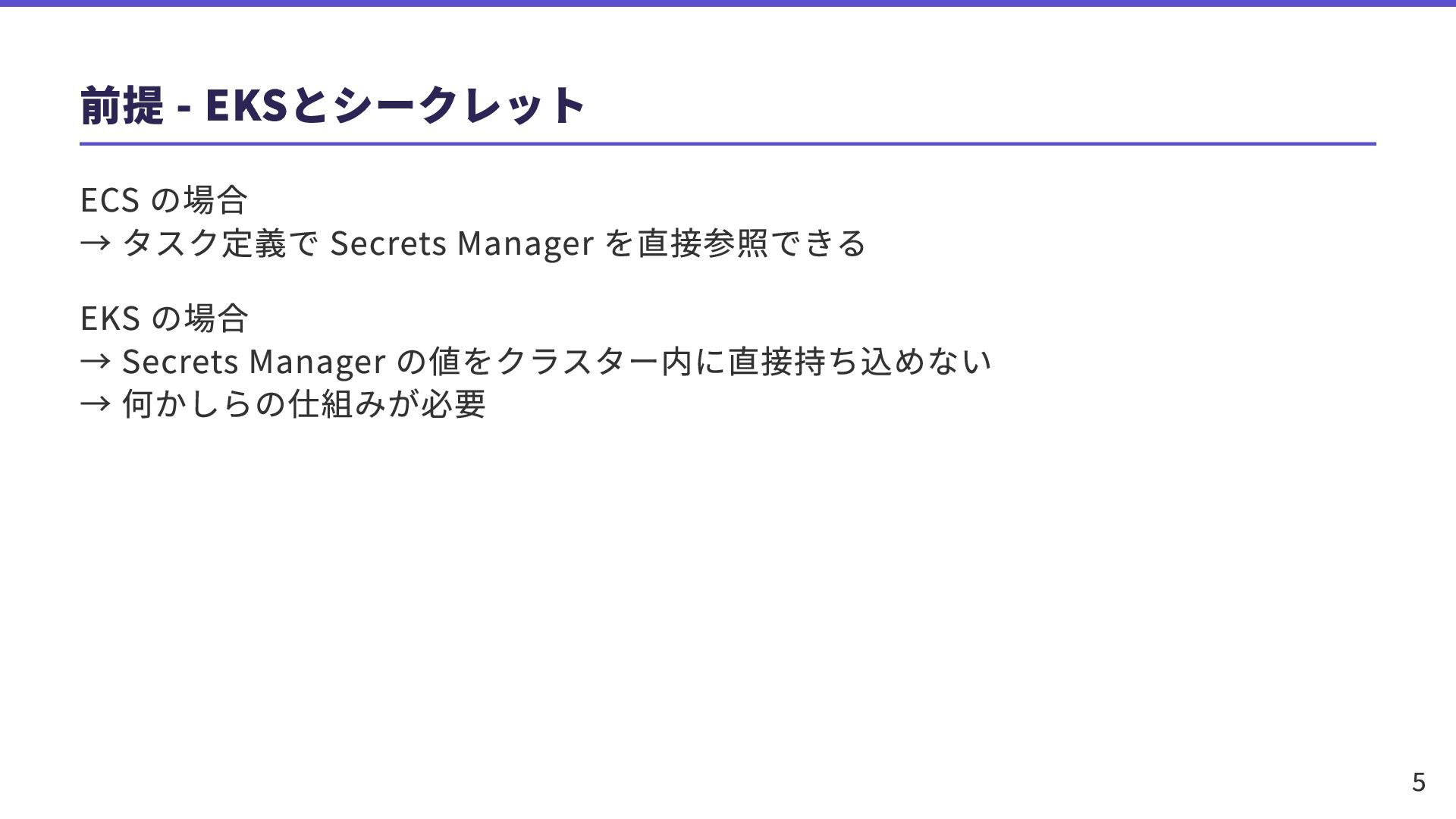 EKS の場合 → Secrets Manager の値をクラスター内に直接持ち込めない → 何かしらの仕組みが必要 5