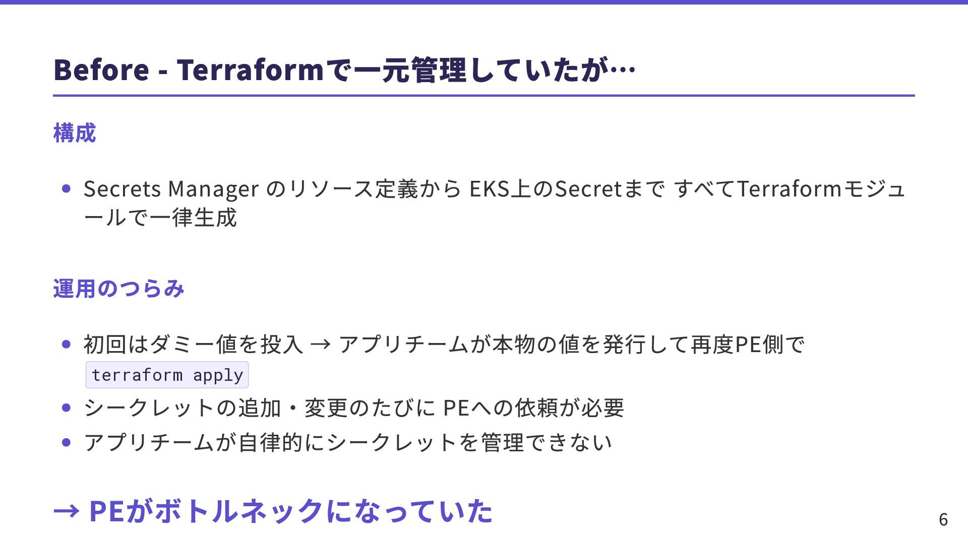 運用のつらみ 初回はダミー値を投入 → アプリチームが本物の値を発行して再度PE側で terraform apply シークレットの追加・変更のたびに PEへの依頼が必要 アプリチームが自律的にシークレットを管理できない → PEがボトルネックになっていた 6